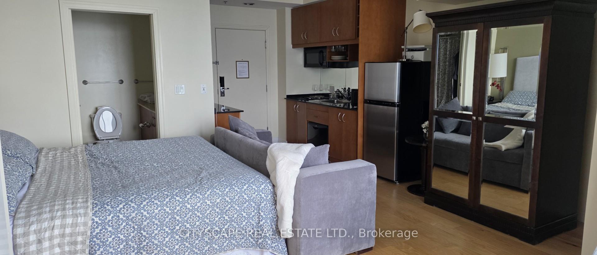 Experience style and convenience in this rarely offered, all-inclusive fully furnished studio. This thoughtfully designed open-concept suite features a cozy bed, functional kitchen workspace, and inviting dining area. Elegantly finished with stylish touches, it includes modern appliances, basic cable and hotel Internet. Enjoy stunning views of the city skyline and an unbeatable location in the heart of Torontos Financial and Entertainment Districts. Located in a beautiful historical building with direct indoor access to King Subway Station. (P.A.T.H.)