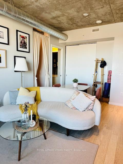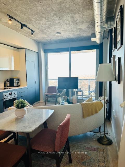 FULLY FURNISHED - 1 Bedroom + Den in Award Winning Building! 570 sq. Ft. of modern loft living w/ combined living room and kitchen, integrated appliance, cement ceilings and exposed ducts. Walk out balcony w/ clear East Exposure from the 27th floor overlooking Corktown Common Park. Spacious bedroom w/ a three door closet system, den is semi enclosed furnished w/ twin bed for guests. Floor to ceiling windows throughout living room and bedroom w/ roll down blinds. Modern four piece bathroom w/ generous storage and installed bidet. Quiet Building and neighbourhood parked in the corner of city. Building is Energy and Environmental Design and has a LEED Gold Certification w/ green roof deck. Within walking to distance to TTC, restaurants, newly built YMCA, shops, Distillery District, Riverdale. Building Amenities: 24 hr Concierge, Gym, Yoga rm, Outdoor Lap Pool, Guest Suites and Party room. Unit will be professionally cleaned throughout prior to occupancy.