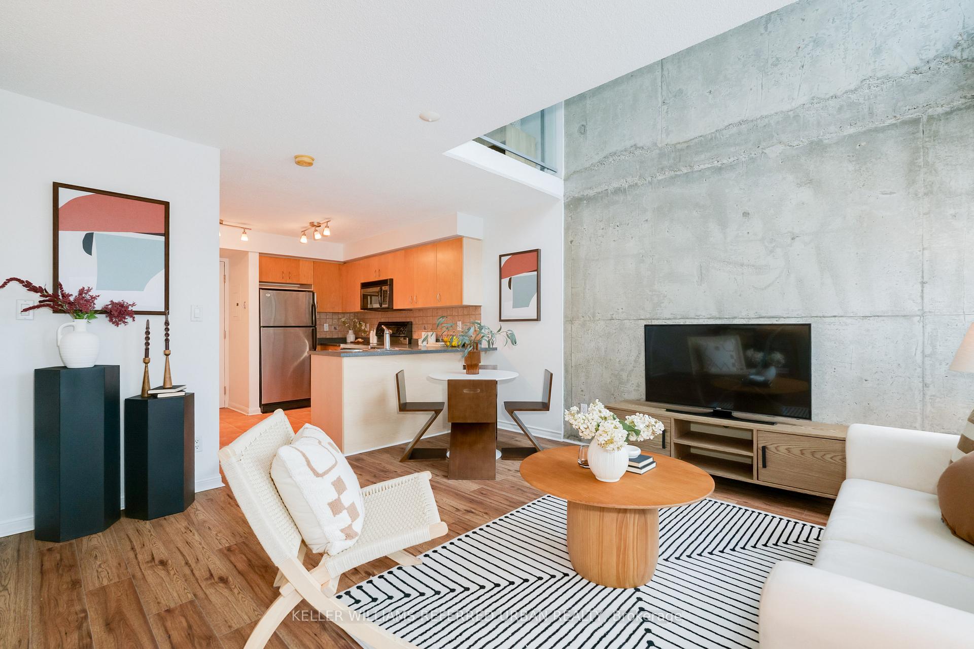Welcome to PH Suite #1004 at Electra Lofts, where bold design meets the energy of King West. This three-storey Loft offers over 915 sq/ft of thoughtfully designed living space and an exceptional outdoor experience with two south-facing balconies, including a rare south facing private rooftop terrace, perfect for entertaining or unwinding above the city. Soak in natural light, the suite showcases dramatic double-height windows that create an airy, contemporary feel throughout. The main level features an open concept kitchen and spacious living area, ready for your personal touch. The second level is a generous primary retreat complete with a walk-in closet and 5 PC ensuite. The oversized bedroom has room for a flex space, perfect as a home office, media lounge, art studio, yoga space or additional lounge area. Set in one of Toronto's most vibrant neighbourhoods, this Penthouse is steps to world-class dining, nightlife, transit, parks, groceries, gyms, coffee shops, all amenities and everything downtown has to offer. Whether you are entertaining under the skyline or immersing yourself in the city below, this is King West living at its finest.