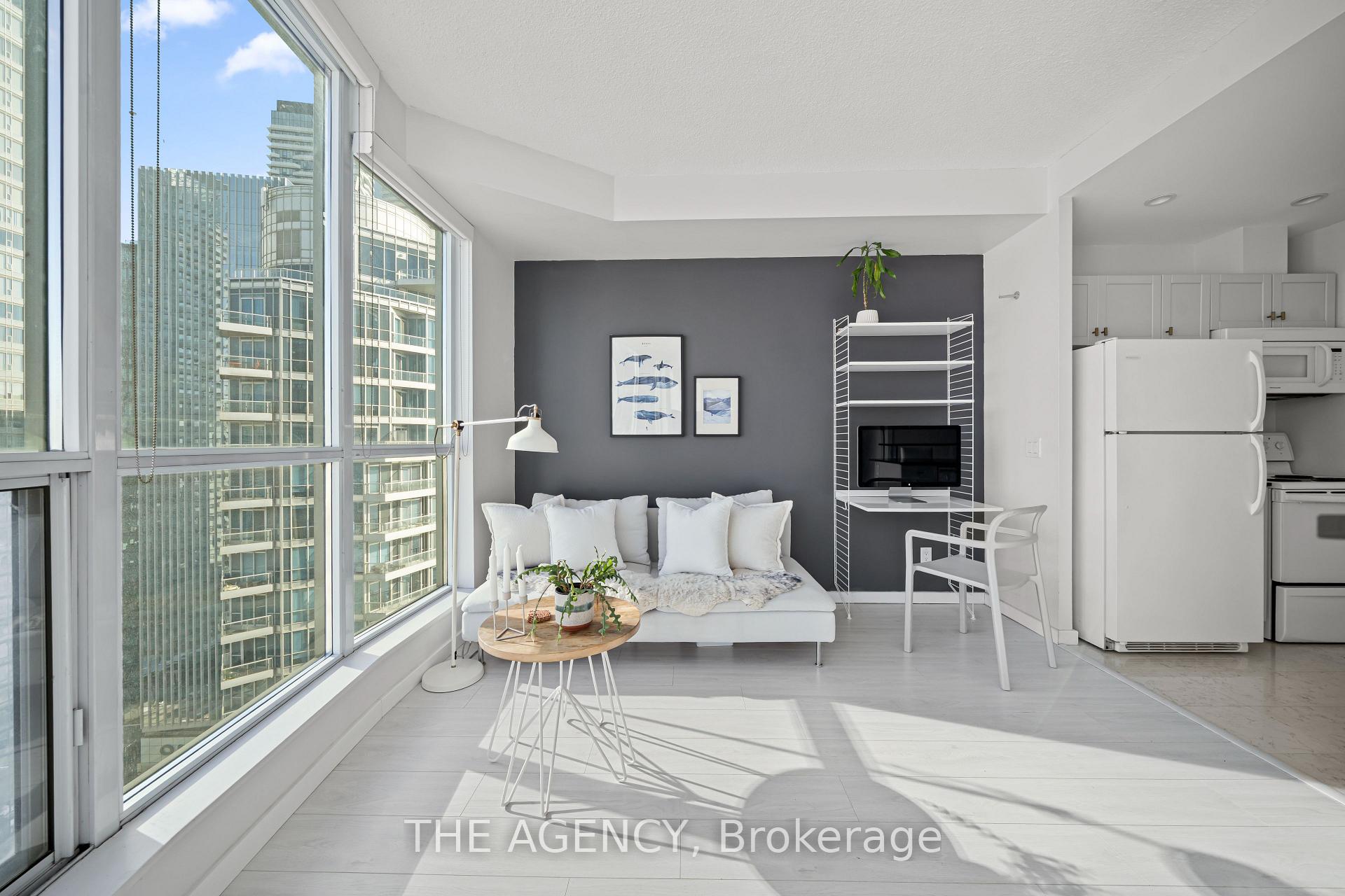 High-Floor Waterfront Living with Exceptional Style. Discover a beautifully upgraded 1-bedroom at Waterclub Condos, where refined finishes and an unbeatable waterfront location come together effortlessly. Bright, impeccably maintained, and truly move-in ready, this suite impresses from the moment you enter. Featuring 9-ft ceilings, laminate flooring, upgraded cabinetry, and a seamless open-concept layout designed for both comfortable living and effortless entertaining. Every detail has been thoughtfully curated to maximize both space and livability. The spacious primary bedroom offers a coveted walk-in closet, controlled blackout blinds for optimal comfort, and a charming Juliette balcony that invites in fresh air and natural light; creating the perfect private retreat for restful nights and relaxed mornings. Floor-to-ceiling windows flood the living area with sunlight while showcasing beautiful CN Tower and skyline views, and a custom blind adds both sophistication and privacy. The modernized bathroom is enhanced by an upgraded sink and contemporary finishes, while abundant storage throughout ensures effortless organization. Ensuite laundry provides everyday convenience, and two wall-mounted TVs are included; a standout feature that makes this home completely turnkey for buyers seeking convenience without compromise. Enjoy resort style amenities including indoor and outdoor pools, a fully equipped fitness centre, sauna, party spaces, and 24-hour concierge service. Perfectly positioned just steps from Lake Ontario and the Harbourfront, this residence offers a vibrant, walkable lifestyle with the TTC, Scotiabank Arena, Rogers Centre, and the Financial and Entertainment Districts all moments away. Stylish, upgraded, and exceptionally located; this is waterfront living at its finest.