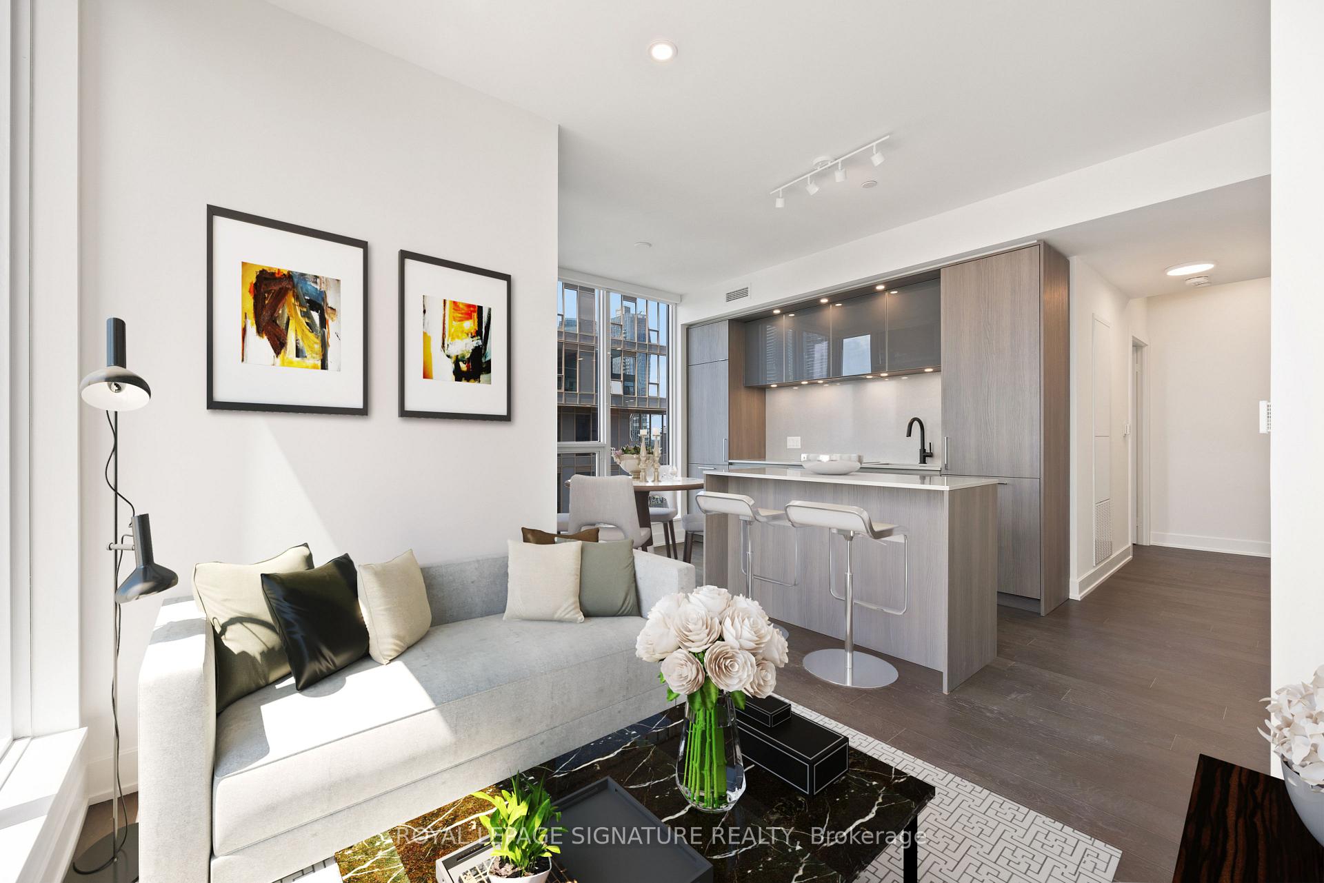 Welcome to the prestigious Nobu Residences, where luxury, design, and lifestyle come together in the heart of downtown.This exceptional 2 bedroom + den, 2 bathroom suite offers an unparalleled blend of sophistication and comfort. Tons of upgrades throughout, the residence features an expansive open concept layout with dramatic floor to ceiling windows that flood the space with natural light and showcase breathtaking, unobstructed views of the Rogers Centre and the iconic CN Tower, a true Toronto skyline experience. This isn't just a view, it's a statement.The sleek, modern kitchen is a showpiece, complete with top of the line built in appliances, premium finishes, and a large island perfect for entertaining. The spacious primary bedroom offers custom closet organizers and a spa inspired ensuite adorned with designer fixtures and elegant detailing. A versatile den provides the ideal space for a home office or additional living area. Residents of Nobu Residences enjoy world-class amenities, including a state of the art fitness centre, stunning outdoor terrace, 24-hour concierge service, and exclusive lifestyle offerings designed for elevated urban living. Perfectly situated steps from premier shopping, fine dining, entertainment, and transit, this remarkable suite delivers the ultimate downtown lifestyle. Property is digitally staged.