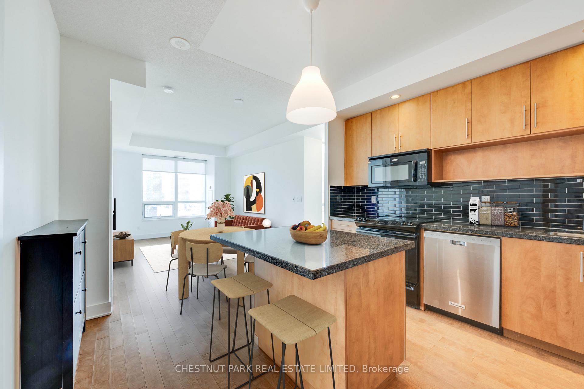 Welcome to Verve Condominiums - a vibrant, master-planned community by Tridel, known for quality construction and thoughtful design.This rarely offered northwest corner suite spans approximately 823 sq. ft. and features a highly desirable split-bedroom layout. The open-concept living, dining, and kitchen area creates an airy, inviting space that's perfect for entertaining. Floor-to-ceiling west-facing windows in the living room frame spectacular city views, which can also be enjoyed from the private balcony walkout.The modern kitchen is beautifully appointed with granite countertops, a glass tile backsplash, and a functional centre island - ideal for casual dining and hosting. The spacious primary bedroom offers a west-facing window, a walk-in closet, and a private 4-piece ensuite. The second bedroom enjoys both north and west exposures and includes a generous double closet. Rich hardwood flooring runs throughout, tying the entire suite together with warmth and elegance.For commuters, convenience is unmatched with access to two subway lines: Wellesley Station on the Yonge line and Sherbourne Station on the Bloor line.Residents enjoy an impressive array of amenities including 24-hour concierge and security, a rooftop pool, outdoor BBQs and terrace, a state-of-the-art tness centre, sauna, billiards room, theatre, and a large party room with catering kitchen. All just steps to shopping, dining, and everyday conveniences.One parking space is included.