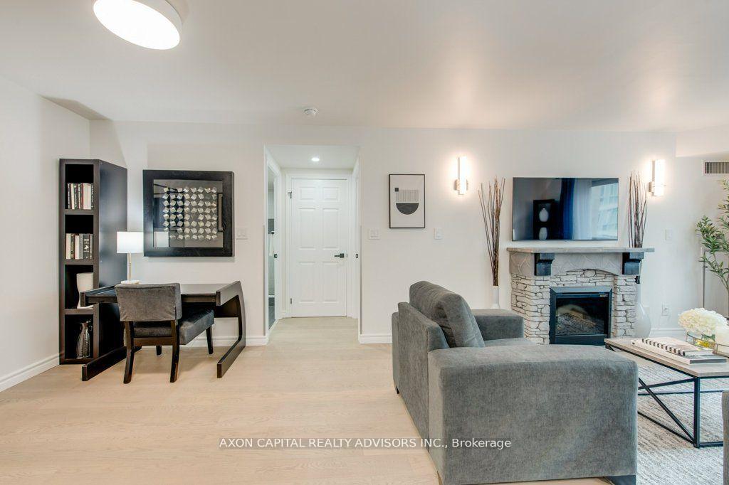 Spacious executive sub-penthouse corner suite at Tridel's Qwest with 1040 SqFt as per builders plan. Enjoy all utilities included in Condo Fees, along with 1 parking space and 1 locker. Featuring an efficient layout with no wasted space, this split-bedroom floor plan offers privacy and functionality with two large bedrooms, two full bathrooms, and two Juliette balconies. The optimally designed and renovated eat-in kitchen features brand new premium KitchenAid appliances, quartz countertops and backsplash, deep undermount sink and ceramic tile flooring. A separate breakfast area features a large window that fills the space with natural light. Hardwood floors run throughout the living room and bedrooms, with additional features including mirrored closets, pot lights in both bedrooms and bathrooms, rainhead showers, and an electric fireplace in the living room. The primary bedroom offers a four piece ensuite and a walk-in closet with custom built-in organizers. The prime downtown location is just steps to the future Ontario Line station at Simcoe & Queen, with easy access to the PATH, TTC, theatres, restaurants, and shopping. Building amenities include a 24 hour concierge, visitor parking, rooftop terrace with BBQ, sauna, hot tub, party room, billiards room, and media room.