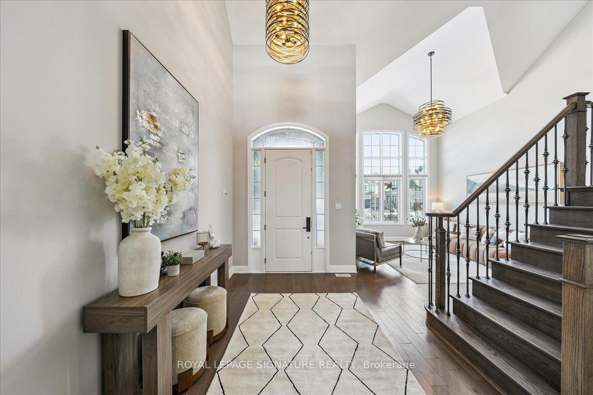 The one you've been waiting for. Welcome to a rare executive bungaloft in the prestigious Rosebank community - thoughtfully designed for downsizers, families, and multi-generational living. Tucked on a quiet court and set on an oversized pie-shaped lot widening to over 100 feet, this custom build by Marshall Homes blends architectural elegance with everyday function. Soaring double-height ceilings elevate the foyer, living, great room, and primary suite while 10 foot ceilings continue upstairs. This ideal layout features two primary bedrooms - a luxurious main floor retreat and a private upper suite. The main floor primary offers two closets (including a walk-in), a tray ceiling, and a spa-inspired ensuite with freestanding tub, glass shower, separate toilet, and double granite vanity. At the heart of the home, the chef's kitchen showcases an impressive granite centre island, undermount sink, and premium Bosch appliances including double ovens, gas cooktop, and full-depth fridge. Extended cabinetry with valance lighting, a walk-in pantry, and a servery add style and practicality. Rich oak hardwood flooring flows through most of the home. Upstairs, the second primary suite includes a walk-in closet and ensuite bath, while the third and fourth bedrooms share a Jack & Jill bath. A generous loft provides additional living space ideal for lounging or working from home. The expansive backyard offers excellent potential to create a true resort-style outdoor oasis. Additional highlights include an approximately 1,500 square foot unfinished basement with 5 windows and 3-piece bath rough-in, 200 amp service, and rough-ins for alarm and central vac. Steps to a notable private school, waterfront trails, and just 5 minutes to Hwy 401, 398 Frontier is a rare offering in Rosebank combining luxury, flexibility, and location.
