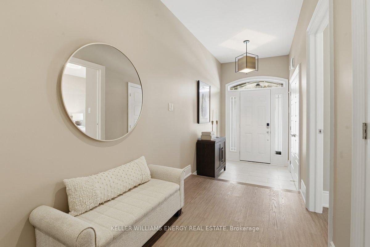 Holland Homes Custom luxury bungalow backing onto environmentally protected land. Wrapped in tumbled stone and brick with a dramatic high-pitched roofline, this rare offering delivers privacy, permanence, and peace. Over 90 builder upgrades in this Charnwood 50 model elevate every detail. You must see the pictures! Open-concept main level is finished in engineered hardwood, oversized baseboards, anchored by a great room with 9 foot coffered "waffle" ceilings, and a chef's kitchen with a statement island overlooking the fireplace. A sun-filled breakfast area walks out to a covered deck and fenced yard... no rear neighbours, no future development, just birds, trees, and sky. The primary retreat features a spa-inspired ensuite with heated floors, freestanding soaking tub and separate glass shower. A second bedroom enjoys its own private ensuite, ideal for guests or home office flexibility. Main-floor laundry allows true one-level living The finished lower level adds a half-bathroom and an oversized media lounge perfect for movie nights, games, or visiting family. The unfinished area offers storage and opportunity to add your own custom rooms Quietly positioned on the east end of George Reynolds Drive, this low-traffic setting offers a country feel while being surrounded by green space. This is downsizing and upgrading at the same time!