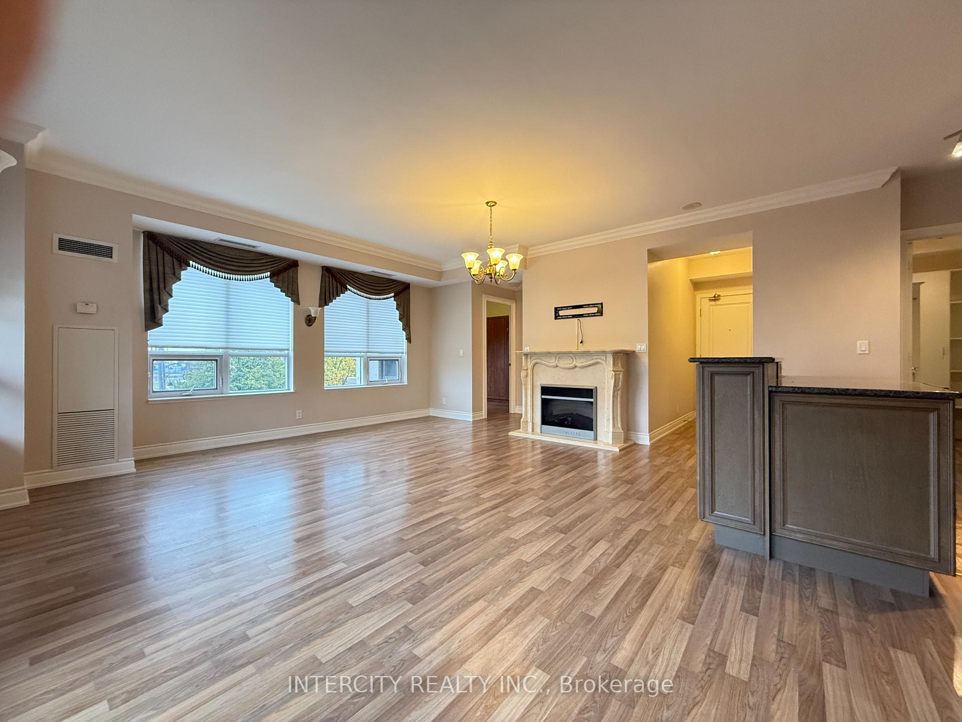 1,060 Sq. Ft. Prime South-East Corner Unit. Suite Overlooks Green Space. Smooth 9Ft Ceiling, Crown Moulding, Marble Fireplace. Kitchen with Ceramic Floor Insert, Granite Back Splash, Counters & Centre Island/Bar, Extended Upper Kitchen Cabinets, Pots & Pan Drawers. Lots Of Windows / Natural Light, Large Balcony. Walk-In Pantry.