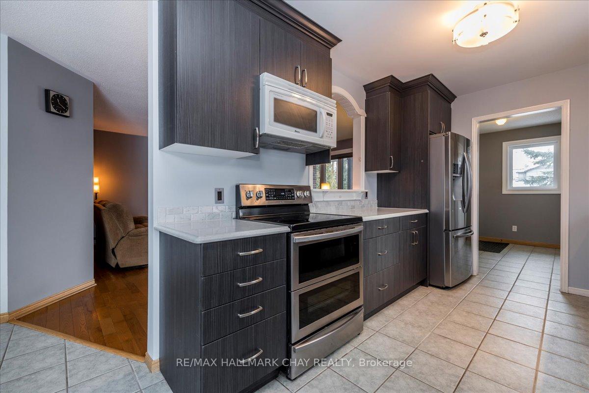 Stunning Lakeside Bungalow With Drive-Thru Garage & Insulated Workshop! Welcome to this beautifully maintained 3-bedroom, 2-full-bath bungalow, ideally set on a picturesque 60' x 240' park-like lot in a sought-after Alcona neighbourhood. A rare offering, the double garage features a drive-thru with a 10' x 8' rear door leading to a detached 23' x 21' insulated workshop-perfect for hobbyists, contractors, or storing all your toys. Inside, enjoy a modern and stylish kitchen with stone countertops and stainless steel appliances, seamlessly flowing into a large formal dining room-ideal for entertaining. The huge living room showcases gleaming hardwood floors and an oversized window with views of the beautifully landscaped front yard. The private primary suite offers a full ensuite bathroom and walk-in closet. Two additional spacious bedrooms provide flexibility, with one featuring double garden doors and a walkout to the expansive back deck-perfect for a home office or guest room. A lovely main bath with front-load laundry completes the main level. KEY UPDATES & FEATURES: Updated windows (2020). 7-car Uni-Stone driveway. Hardwood & ceramic flooring. Large foyer with double closets. Cozy covered front porch. Massive backyard with fire-pit area. Tons of storage and parking. Located close to schools, parks, shopping, and all amenities-and just minutes to the sparkling shores of Lake Simcoe-this exceptional property offers lifestyle, space, and versatility in one unbeatable package.