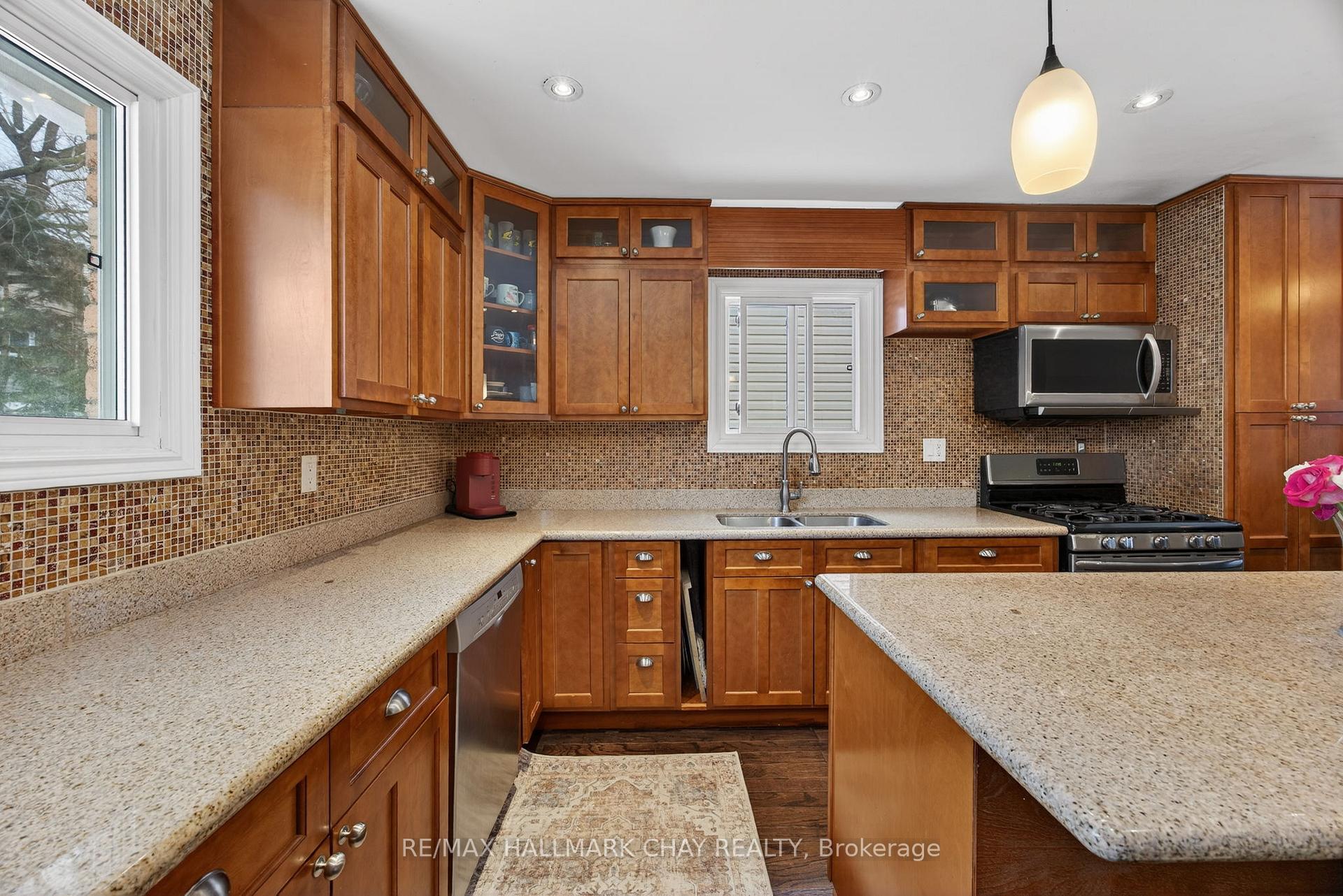 Well maintained 5-level sidesplit sitting on a 50 x 110 ft lot with a double car garage, offering a functional and versatile layout. Spacious, bright family room with built-in cabinetry, cozy fireplace, and walk-out to the deck. Open concept living and dining area, ideal for everyday living and entertaining. Updated kitchen features granite countertops and stainless steel appliances. Primary bedroom includes a 3-piece ensuite, walk-in closet, and additional built-in closet. All bedrooms are generously sized. Finished basement offers two bedrooms with above-grade windows, two recreation rooms, and two additional storage areas. Equipped with a sump pump and extra battery. Numerous updates include all windows, furnace, air conditioning, and roof (2015). Vinyl siding completed in 2016 with added insulation. Conveniently located close to Highway 404, schools, shopping, Costco, and the new plaza at Davis Drive and Harry Walker Parkway.