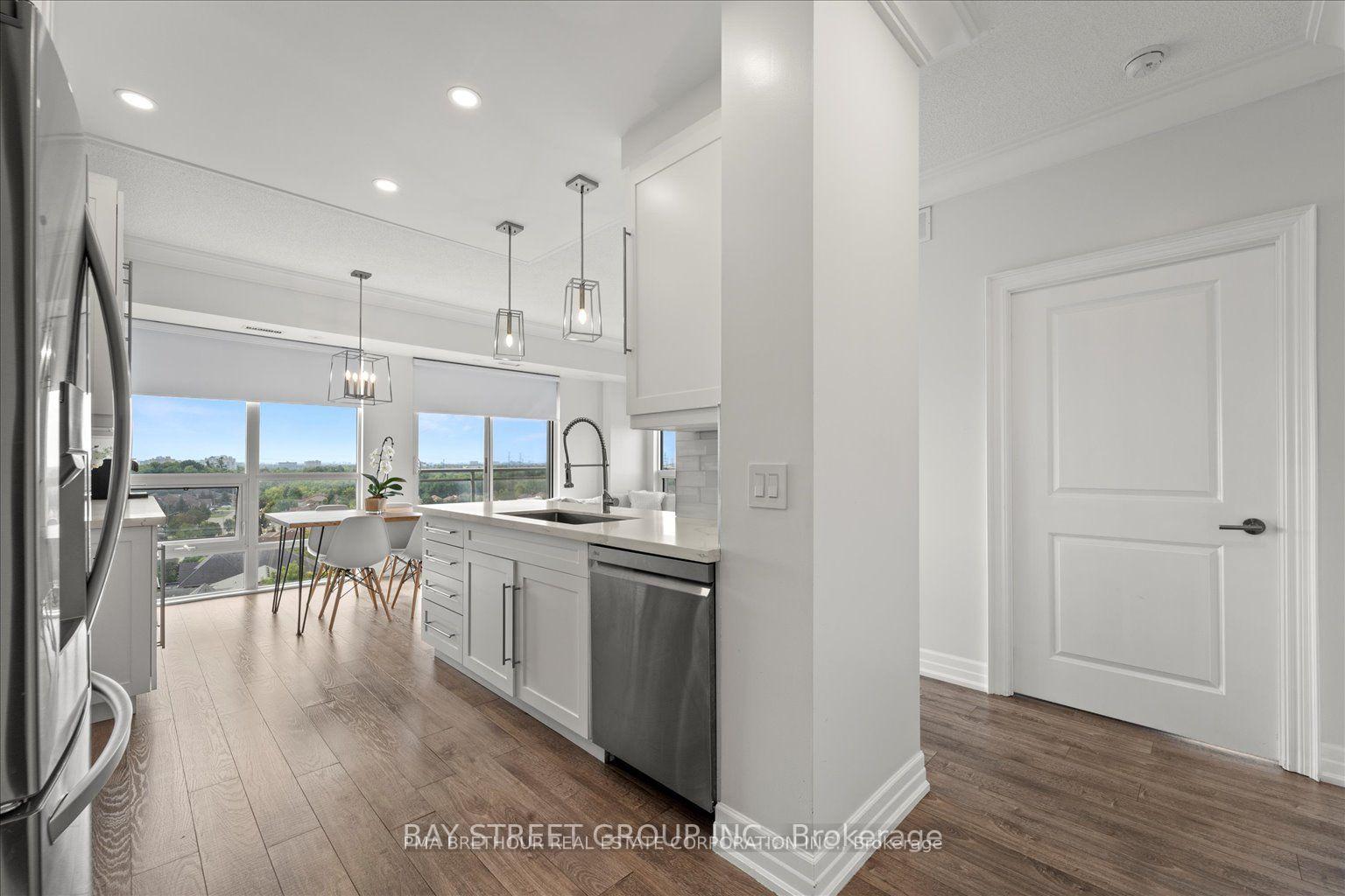 Absolutely stunning southwest-facing corner suite in the heart of Vaughan's West Woodbridge! This rare 2-bedroom, 2-bathroom layout offers approximately 920 sq ft of sun-filled, open-concept living and a spectacular wrap-around balcony with breathtaking, unobstructed views of the Veneto ravines and Toronto skyline. Floor-to-ceiling windows flood the space with natural light, complemented by motorized blinds and a modern rustic design that is both stylish and inviting. The chef-inspired kitchen features quartz countertops, custom backsplash, stainless steel appliances, centre island, valance lighting, crown moulding, and pot lights, flowing seamlessly into spacious living and dining areas with walk-out to your private outdoor retreat-perfect for entertaining. The primary bedroom offers a built-in closet and a beautifully upgraded 4-piece ensuite with marble floors and LED mirror, while the second bedroom showcases floor-to-ceiling windows and ample storage. Additional highlights include a large welcoming foyer, ensuite laundry, built-in speakers, upgraded lighting with USB outlets, 1 owned underground parking space, and 1 owned locker conveniently located on the same level. Well-managed building with premium amenities including gym, party room, rooftop terrace, sauna, security system, and visitor parking. Steps to parks, schools, transit, library, and recreation centre. A rare opportunity to own a bright, upgraded corner unit with incredible views-this one shows beautifully!