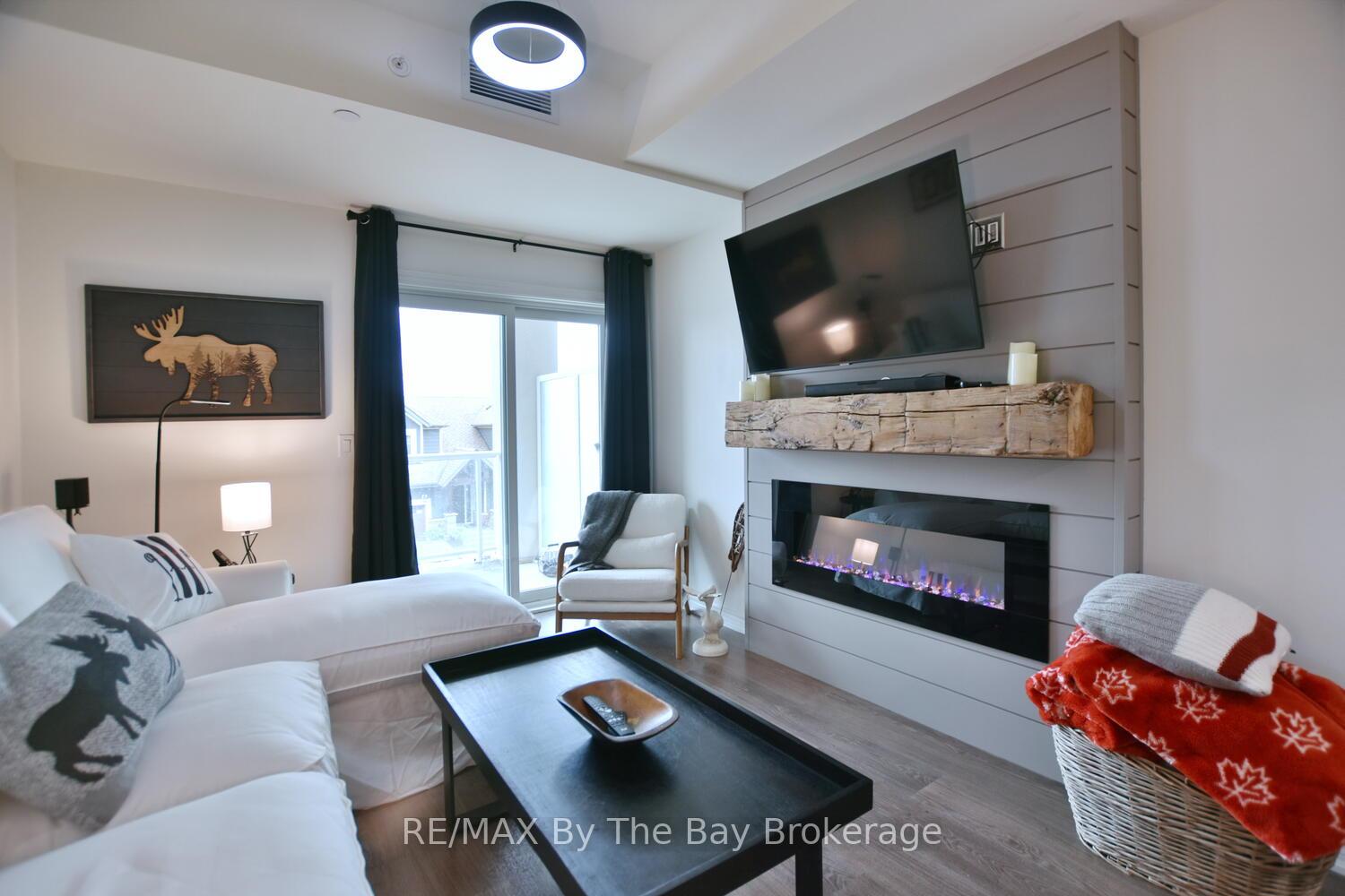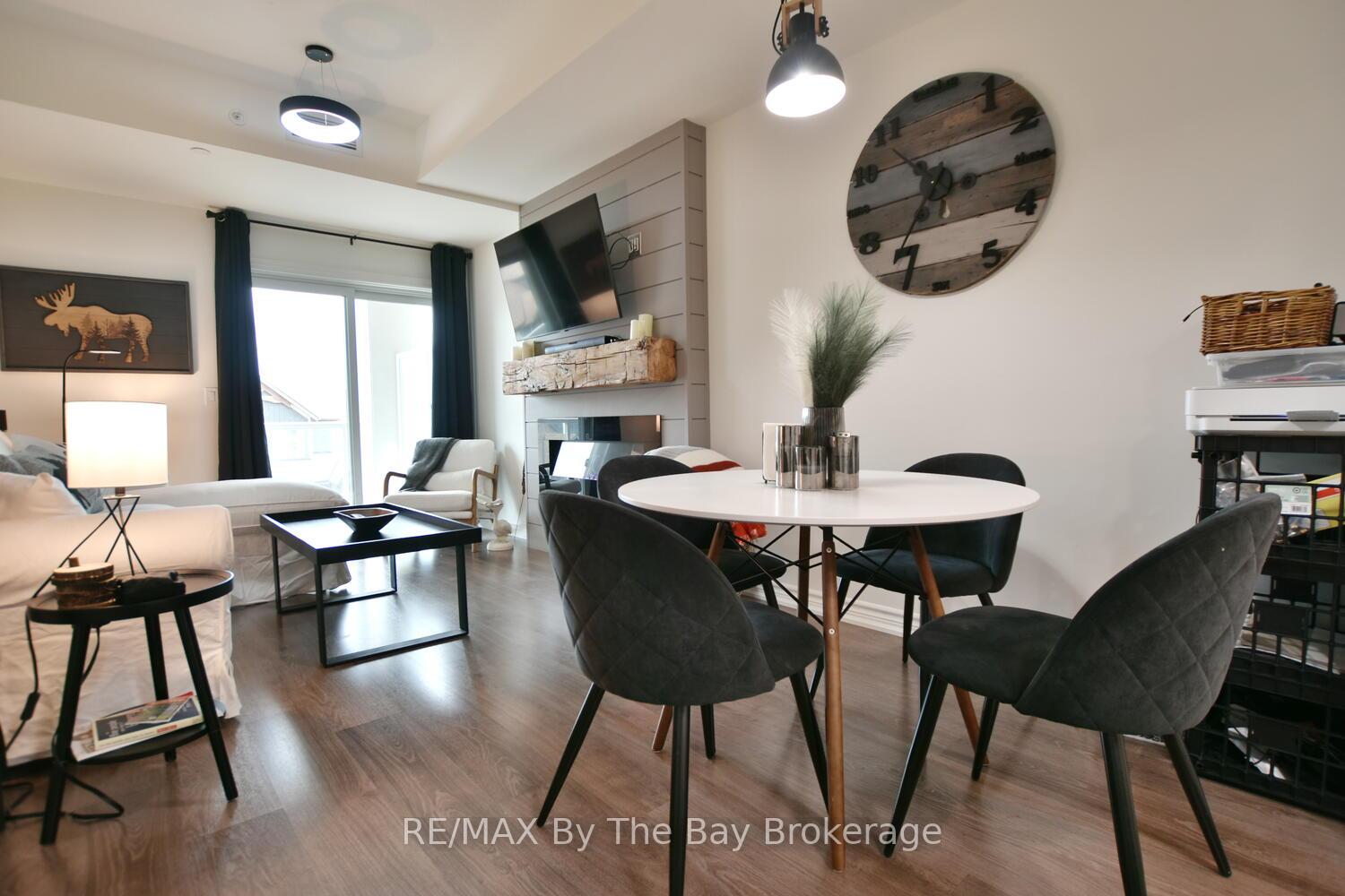 Welcome to Maintenance-Free Condo Living in the Heart of Collingwood. Discover the charm of Collingwood's sought-after Blue Fairway community with this beautifully appointed 2-bedroom, 2-bathroom condo. Perfectly situated just steps from the stunning Cranberry Golf Course, this condo offers the ultimate blend of luxury, comfort, and convenience. Step inside to an open-concept layout designed for modern living complete with beautiful upgraded lighting, barn doors and window coverings. The stylish upgraded kitchen features a large island, stainless steel appliances, accent lighting and custom cabinetry with updated hardware which is ideal for casual meals or entertaining guests. The bright living room with its cozy fireplace and dining area flows seamlessly together, creating a warm and inviting space. Both bedrooms are generously sized, and the spa-inspired bathrooms offer a touch of everyday indulgence. Extend your living outdoors on the spacious patio with serene distant views of the golf course and Blue Mountain in the distance. Practical touches include elevator access for easy grocery trips, underground parking, and a convenient storage locker. Residents enjoy exclusive access to the outdoor pool and recreation centre, making this the perfect four-season destination. Located close to restaurants, shopping, biking trails, golf, and skiing, this condo places the best of Collingwood right at your doorstep.