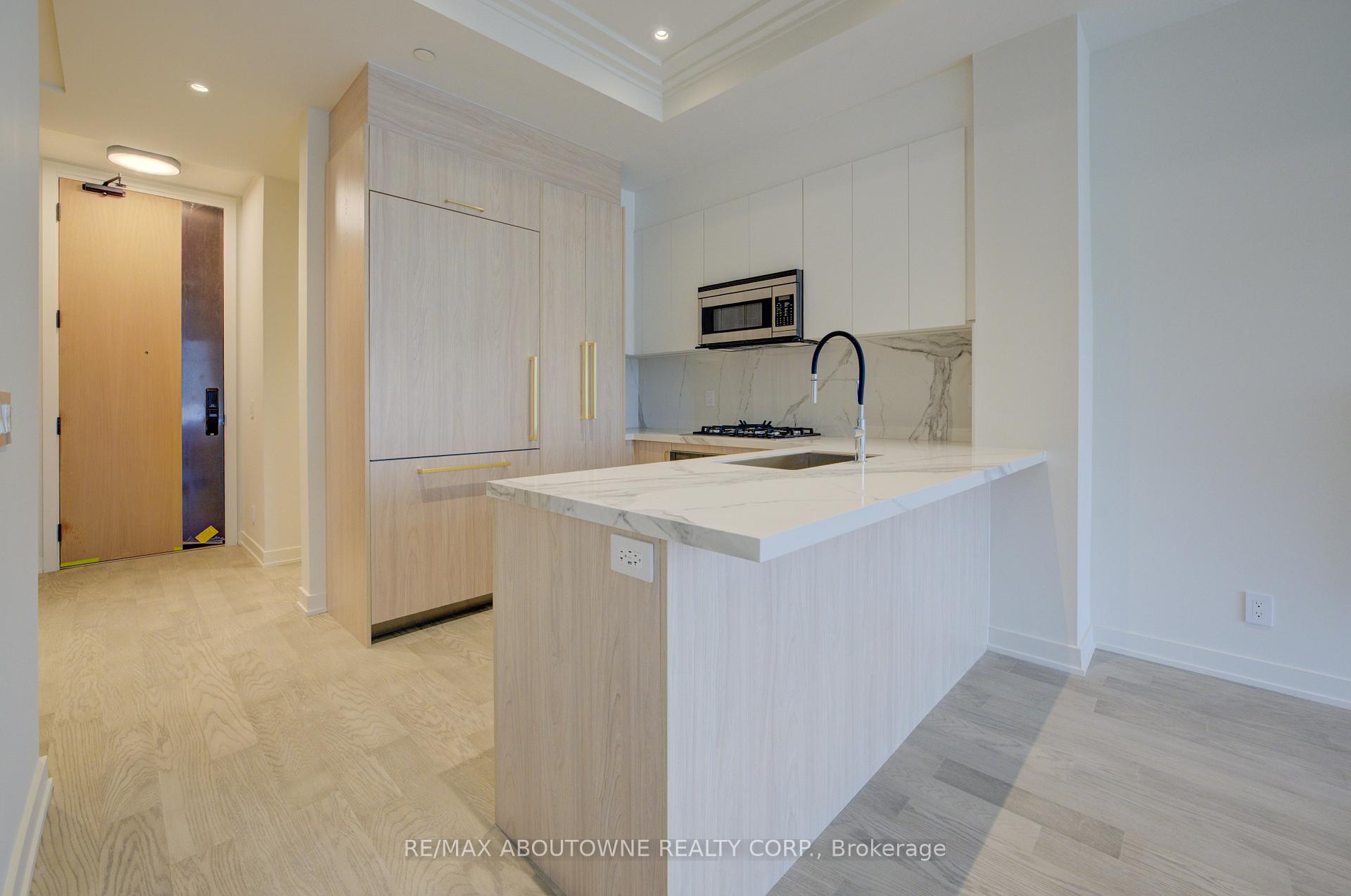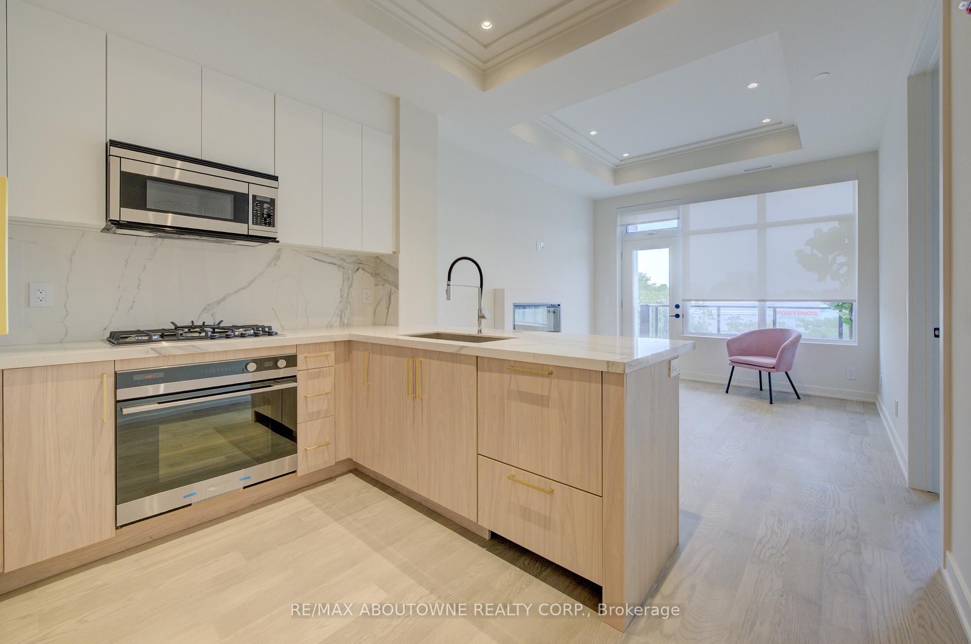 Berkshire Residences is downtown Oakville's newest luxury building, steps to shops, restaurants, cafes, Oakville Harbour, the Oakville Club, Tannery Park, and lakefront pier.This upgraded southeast-facing executive suite offers a private 10' x 6' balcony with natural gas hookup overlooking South Lakeshore. The custom layout features 10 ceilings, engineered wood flooring, coffered ceilings, upgraded paint, dimmable pot lights, zero-gravity roller shades, and a custom stone built-in electric fireplace.The two-tone kitchen has been upgraded with marble countertop and backsplash, under-cabinet lighting, 4 pot lights, gold hardware, Riobel pull-out faucet, bar ledge, filler strip to the ceiling, and Fisher & Paykel built-in appliances. The living room includes 6 pot lights and a garden door walkout to the balcony.The primary ensuite offers an upgraded frameless glass shower with rain head and handheld fixtures, wall-mounted vanity with marble countertop, backlit mirror, upgraded porcelain tile floors and shower walls, and 4 pot lights. A separate 2-pc bath is conveniently located away from the main living area. A versatile room with 10 ceilings and 4 pot lights can serve as a full-sized office or dining space. Ensuite laundry includes full-size Electrolux washer and dryer. A wall-mounted iPad provides smart control of mechanical systems. Building amenities include concierge and security, with planned fitness centre, landscaped rooftop terrace, and party room with full kitchen and lounge. One underground parking space and one locker are included.Triple AAA executive tenant only. Non-smoker. No pets. Tenant to provide OREA rental application, credit check, proof of income, and tenant insurance. Tenant pays all utilities including water and hydro.Walking distance to downtown Oakville, Tannery Park, Fortinos, coffee shops, restaurants, schools, and shopping. Easy access to QEW, 403/407, and GO Train.