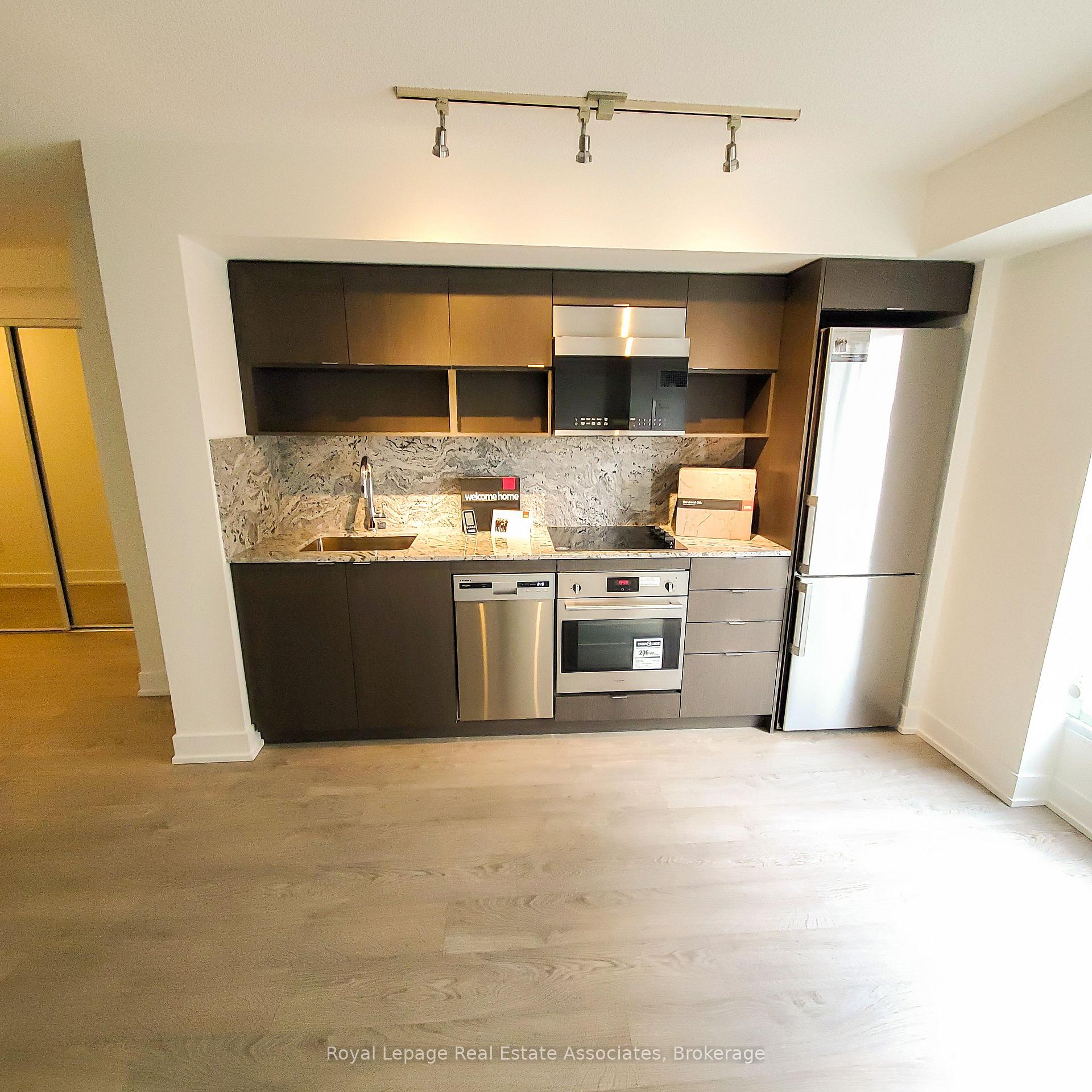 Welcome to Bloorvista at Islington Terrace by Tridel - a bright and modern 1-bedroom suite offering a well-designed open-concept layout with clean, contemporary finishes throughout. The suite features wide-plank flooring and a spacious living and dining area that comfortably accommodates flexible furniture arrangements for both everyday living and entertaining. Floor-to-ceiling windows bring in abundant natural light, while the Juliet balcony adds fresh air and an open, airy feel. The sleek kitchen is finished with full-size stainless steel appliances, quartz countertops, modern flat-panel cabinetry, a striking stone backsplash, and track lighting, delivering both style and functionality. The bedroom is well-proportioned and bright, offering ample space for a queen-sized bed and additional furnishings, along with a large mirrored sliding-door closet with built-in shelving. The bathroom features clean tile finishes, a full-size tub/shower combination, a modern vanity with integrated sink, and contemporary fixtures. For added convenience, the suite includes a stacked Whirlpool washer and dryer tucked neatly into a dedicated laundry closet. One underground parking space is included. Residents of Islington Terrace enjoy an exceptional collection of amenities including a 24-hour concierge, indoor pool, fitness centre, yoga studio, basketball court, party lounge, theatre room, rooftop terrace with BBQ areas, children's play zone, and more. Ideally located just steps to Islington Subway Station, with easy access to shops, cafés, parks, and major commuter routes, this suite offers modern comfort and unbeatable connectivity in one of Etobicoke's most sought-after communities.