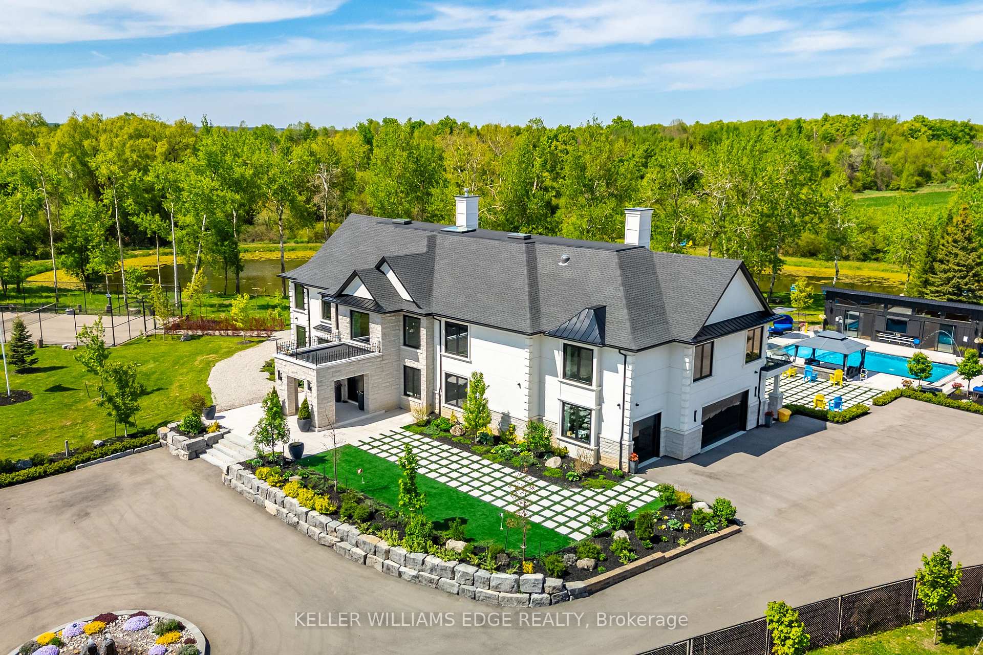 A truly rare offering. Set on 5.76 acres of private, tree-lined grounds, this custom-built estate presents an exceptional opportunity to own a secluded executive retreat minutes from the GTA. Thoughtfully designed and meticulously crafted by its original owners, the residence balances architectural presence with everyday livability, offering space, privacy, & quality that is difficult to replicate. A dramatic 22-foot foyer with a striking floating staircase creates a commanding first impression, while expansive floor-to-ceiling windows frame serene natural views & flood the home with sunshine. The layout is intentionally designed for both grand-scale entertaining and comfortable family living. At the centre of the home is a remarkable chef's kitchen featuring dual oversized islands with seating for up to fourteen, premium appliances, & seamless flow to the sunroom & outdoor kitchen, ideal for hosting, gatherings, & year-round entertaining. This estate offers an extensive collection of resort-style amenities, including a private spa with a 10-person jacuzzi, steam room, & sauna, plus a fully equipped home theatre, gym, games area, & full bar. A private elevator enhances convenience across all levels. Above the garage, a three-bed guest suite provides flexibility for extended family, guests, or live-in support. The outdoor experience is equally impressive: heated saltwater pool, two fire pit areas, tennis & basketball courts, walking trails surrounding a tranquil private pond, & multiple outdoor spaces designed for relaxation and entertaining, all within complete privacy. The property is equipped with solar & geothermal systems, full smart-home integration, & dual septic systems, reflecting a commitment to sustainability, efficiency, & long-term ownership. A rare legacy estate offering privacy, land, & lifestyle without sacrificing proximity to major urban centres. An exceptional opportunity for the discerning buyer seeking space, discretion, & enduring value.