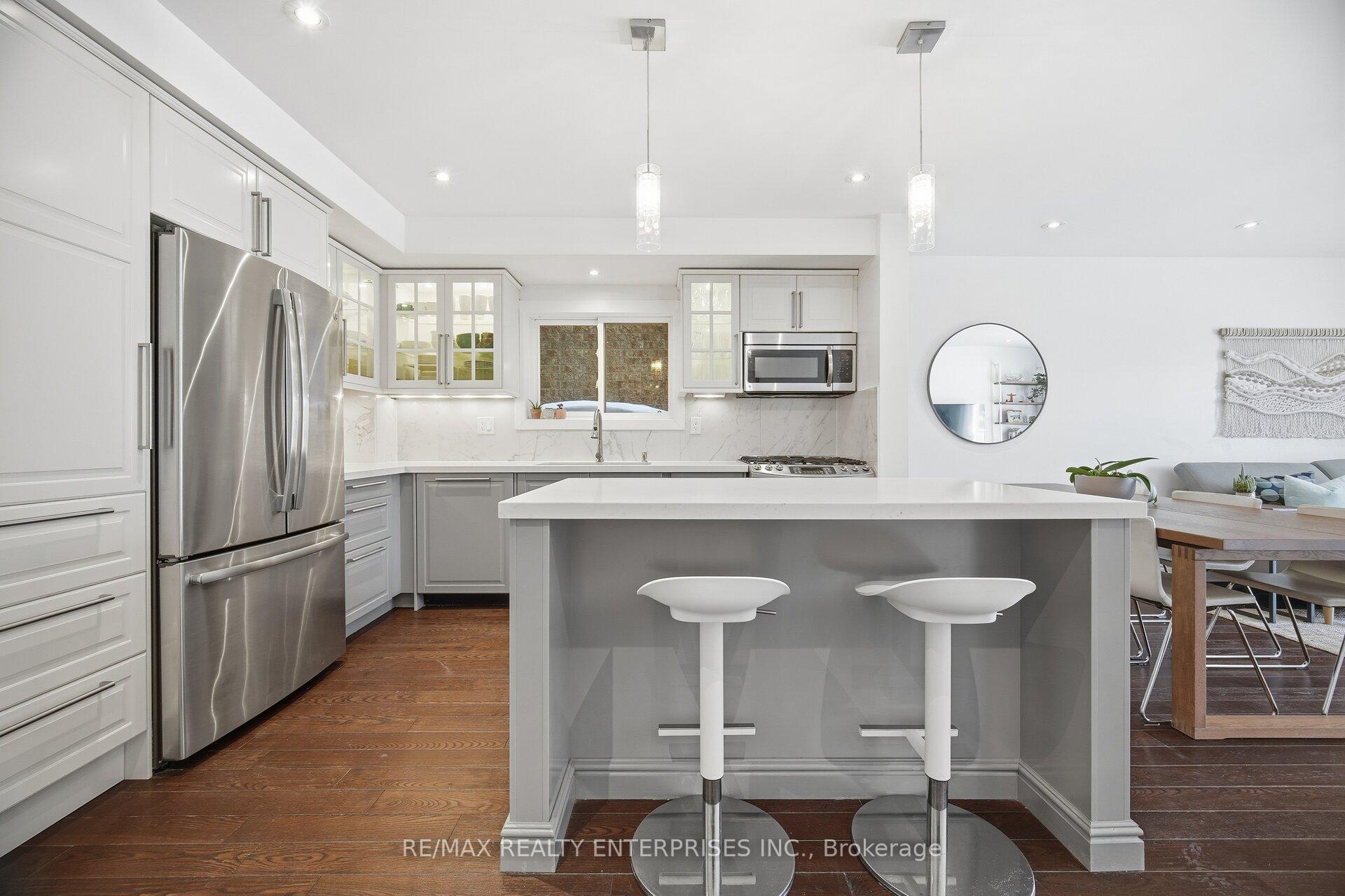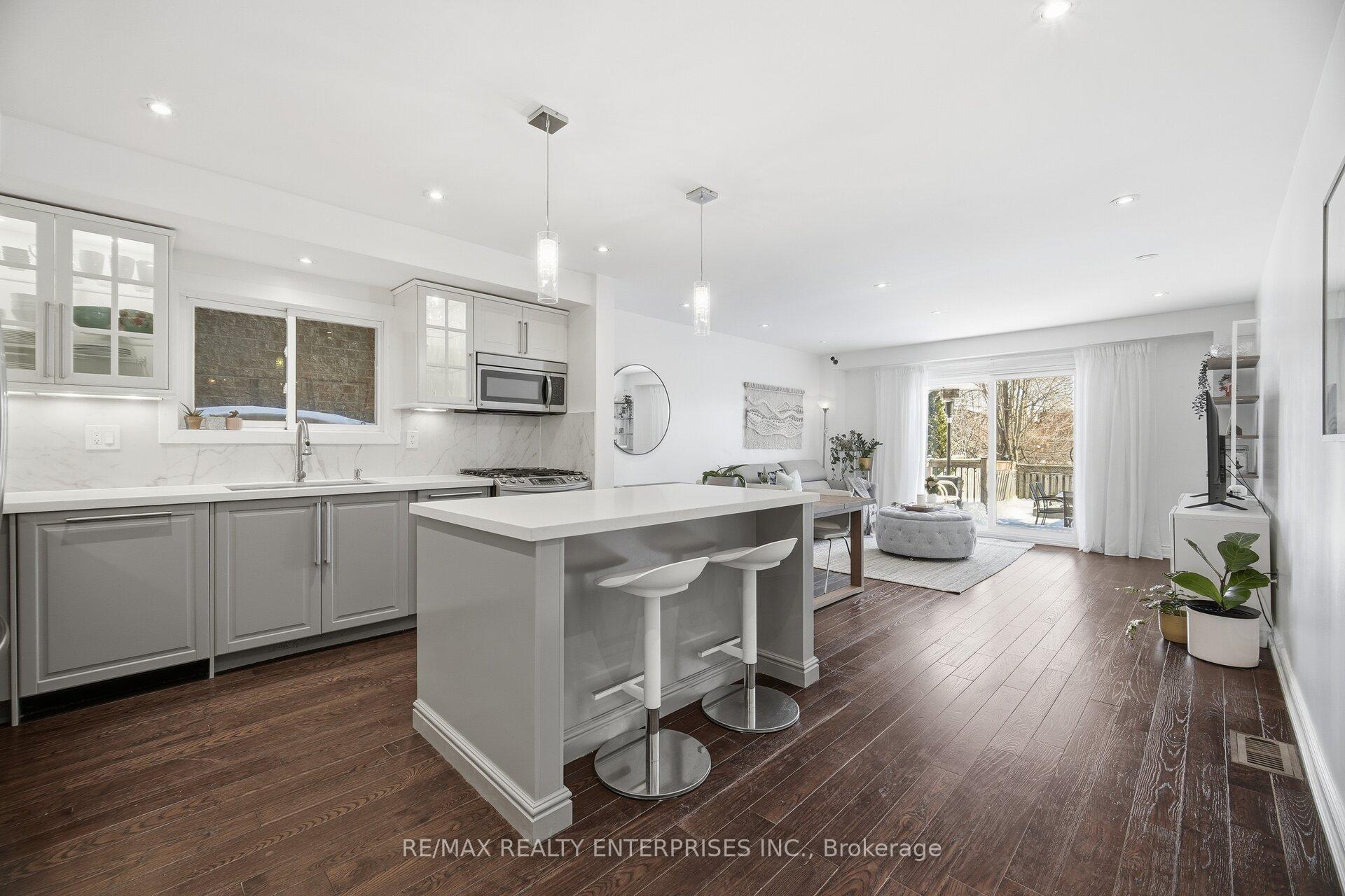 Freehold townhouse on a spectacular 142-ft deep ravine lot-and yes, that alone is impressive, but there's so much more to love.This beautifully updated home features a thoughtfully designed open-concept main floor with pot lights, hardwood flooring, andflat ceilings throughout. The stunning kitchen is the heart of the home, showcasing a large island, quartz countertops, glasscabinets with interior lighting, and stainless steel appliances, including a gas stove. The dining and living areas flow seamlesslyand lead to sliding doors opening onto a private, fully fenced backyard with a large deck and breathtaking ravine views.Convenient backyard access to the garage adds extra functionality.Midway to the second level, enjoy a bonus family room featuring pot lights, flat ceilings, a cozy gas fireplace, and a large window.The upper level offers three spacious bedrooms, all with hardwood floors, including a generous primary bedroom, and awell-appointed 5-piece bathroom.The finished basement boasts flat ceilings and pot lights throughout, offering a large recreation area, a 4th bedroom or den, anda beautiful 3-piece bathroom with heated floors, plus laundry with heated floors for added comfort.Ideally located close to all amenities, excellent schools, major highways, public transit, and scenic trails-this home offers theperfect blend of style, comfort, and nature.