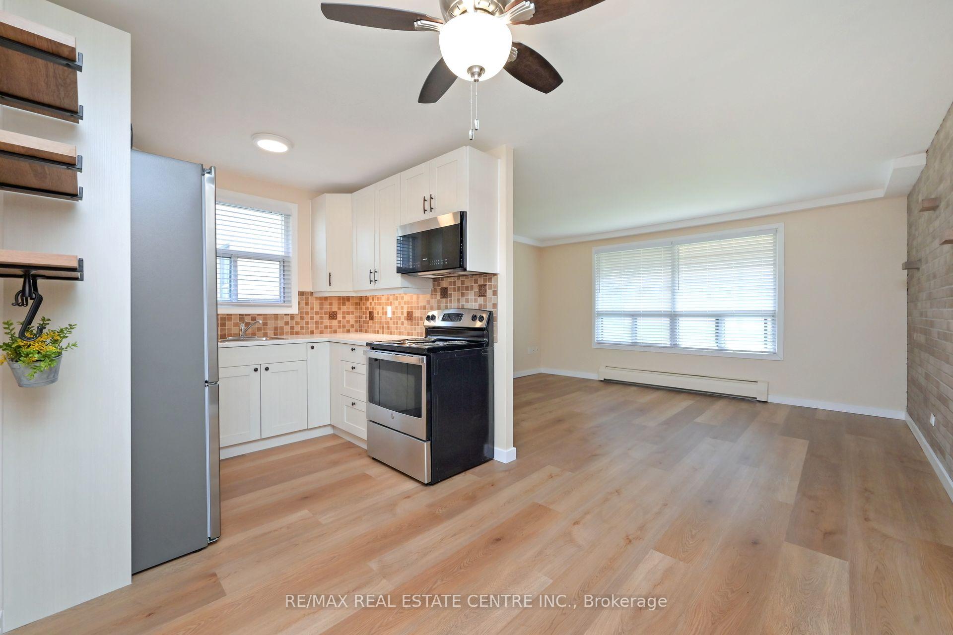 Gorgeous main level condo apartment in convenient location to all amenities Orangeville has to offer. Trails, Shopping, Dining, Theatre, library, parks and more. Renovated throughout with unique brick wall feature. Fridge, Stove and Microwave (all brand new) included. Amazingly spacious with quick and easy access to front street level. Laundry facilities in building (#63). Exclusive use parking space and guest parking available.Condo maintenance fees include: heat, water, maintenance of common areas, and building taxes and insurance.