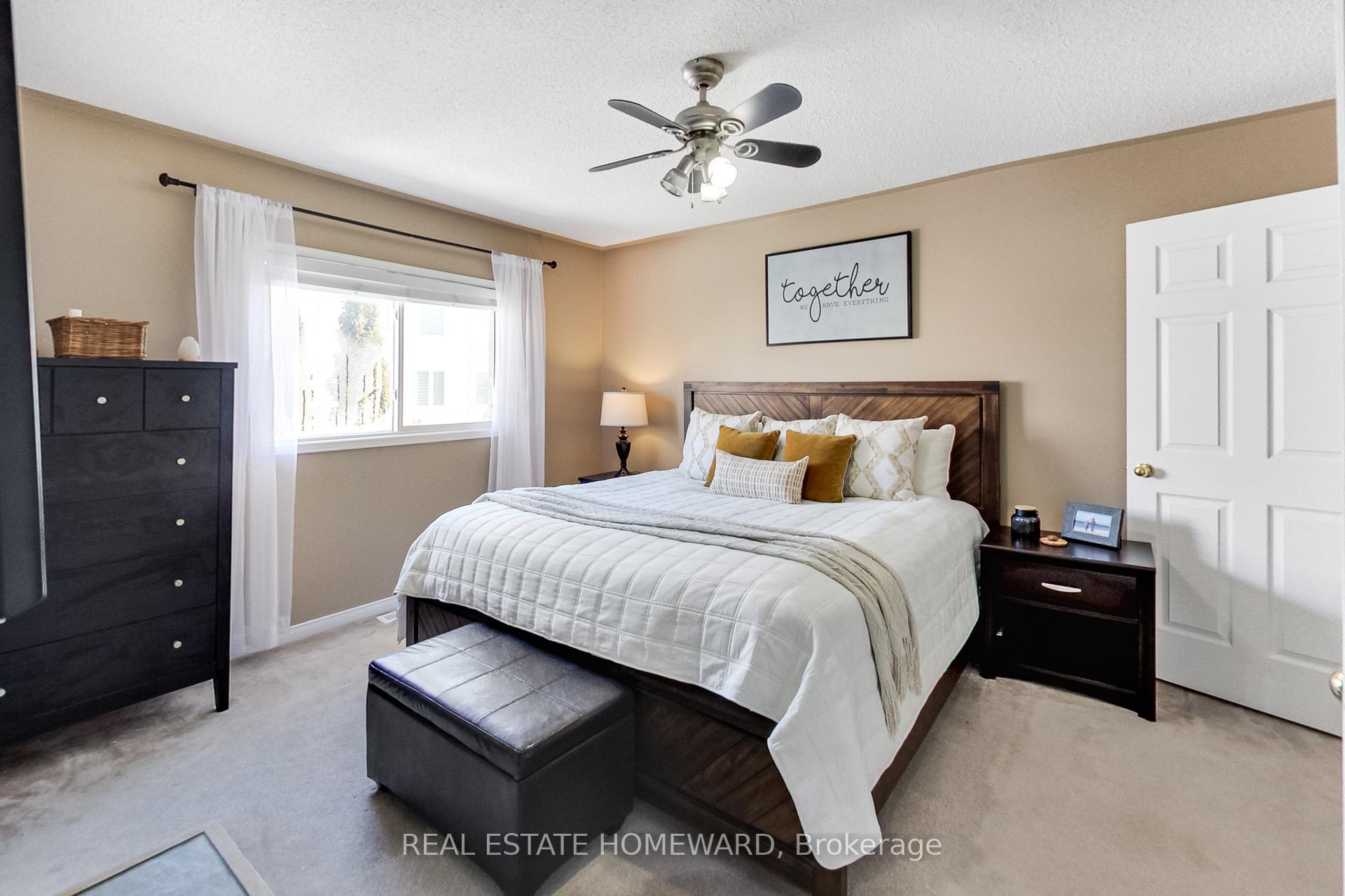 Fabulous end-unit townhome in a desirable community, offering a bright, open-concept living and dining area. Spacious kitchen with ample cabinetry, centre island with breakfast bar, pantry, stainless steel appliances, and updated backsplash. Hardwood floors throughout the main level with walk-out to patio and mature backyard.Second floor features three generously sized bedrooms with large windows. Primary bedroom accommodates a king-size bed and includes a walk-in closet with organizer and 4-piece ensuite. Finished basement provides additional living space with laminate flooring and adjacent laundry area with storage.Extras: Double front doors (2020), sliding glass door (2020), shingles (2013), garage door (2012), Moffat fridge & GE dishwasher (2020), Whirlpool stove (2024), Samsung washer & dryer (2017).