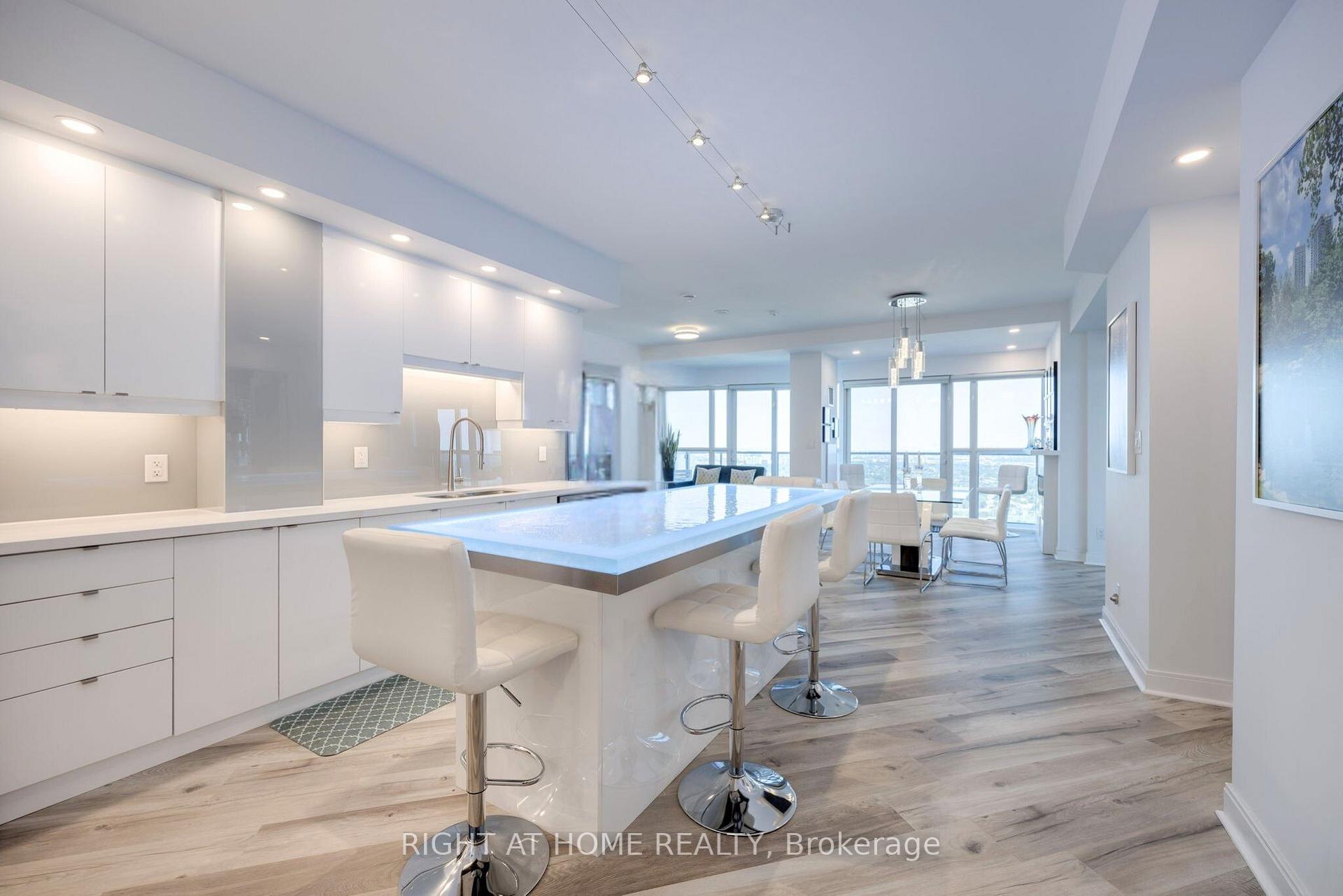 VIEW: This fully renovated 1,105 sq. ft. contemporary residence offers panoramic, unobstructed views of the CN Tower and Lake Ontario, framed by floor-to-ceiling windows and a 225 sq. ft. wrap-around terrace. Southeast exposure delivers stunning sunrises and exceptional natural light throughout the day. KITCHEN: Designed for modern living and entertaining, the custom kitchen features over 30 high-gloss cabinets, a custom tinted glass backsplash, and a striking 8-foot island with an LED-lit glass countertop. BATHS: Both bathrooms have been fully renovated with high-end finishes for a cohesive, move-in-ready experience. PRIMARY SUITE (INTEGRATED STORAGE - NO EXTRA FURNITURE REQUIRED): The primary bedroom is intelligently designed with built-in floor-to-ceiling dual wardrobes with drawers and an integrated queen bed with hidden storage (hydraulic lift), eliminating the need for bulky dressers. The bed platform and wardrobes are included-just bring your Queen mattress. SECOND BEDROOM/HOME OFFICE: Comfortably accommodates a queen-size bed and dresser, featuring an oversized closet and direct access to the balcony. SMART TECH: Fully integrated smart home features with voice-controlled lighting throughout the main living areas let you set the ambiance effortlessly. PARKING & STORAGE: Includes TWO premium parking spaces and a large storage locker, a rare offering in this location. AMENITIES: Resort-style amenities include a fitness centre, indoor/outdoor pools, pickleball, basketball and squash courts, and 24-hour concierge. LIFESTYLE: Located at Mississauga's most iconic address, just steps to Square One, dining, transit, and the upcoming LRT. PREFERRED CLOSING: May 1, 2026 (negotiable) KEY UPGRADES: Integrated primary suite storage, 8-foot island with LED-lit glass countertop, smart lighting, two parking spaces. Don't miss out on checking the building website: https://60absolute.ca/