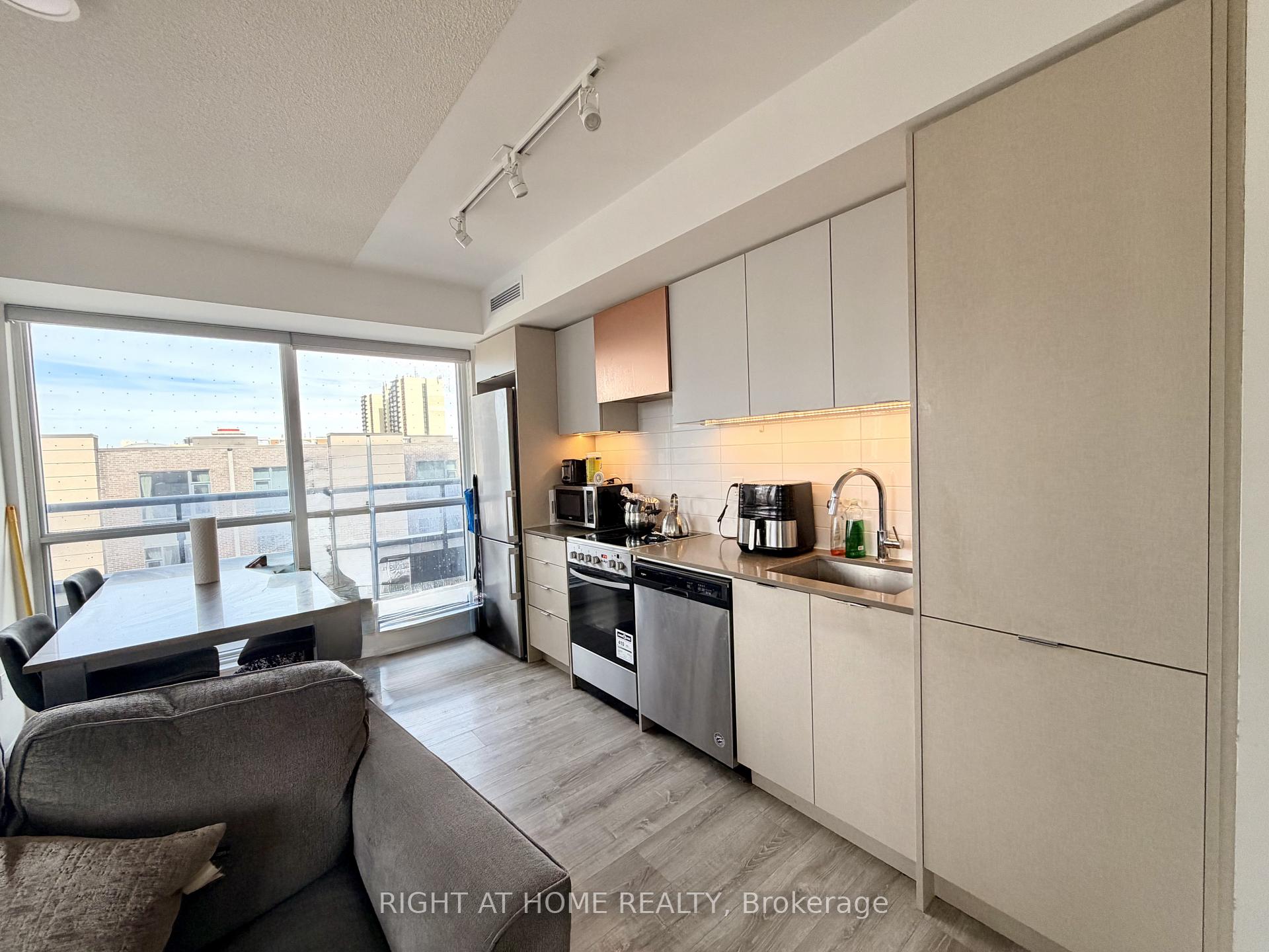 Fully upgraded 2 + 1 bed, 2 bath unit.Open concept living space with laminate flooring.Upgraded window coverings and pot lights throughout.196sqft wrap around terrace with BBQ gasline.Includes parking and locker.Close to public transit, Hwy 427, shopping, and amenities.