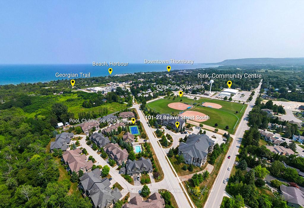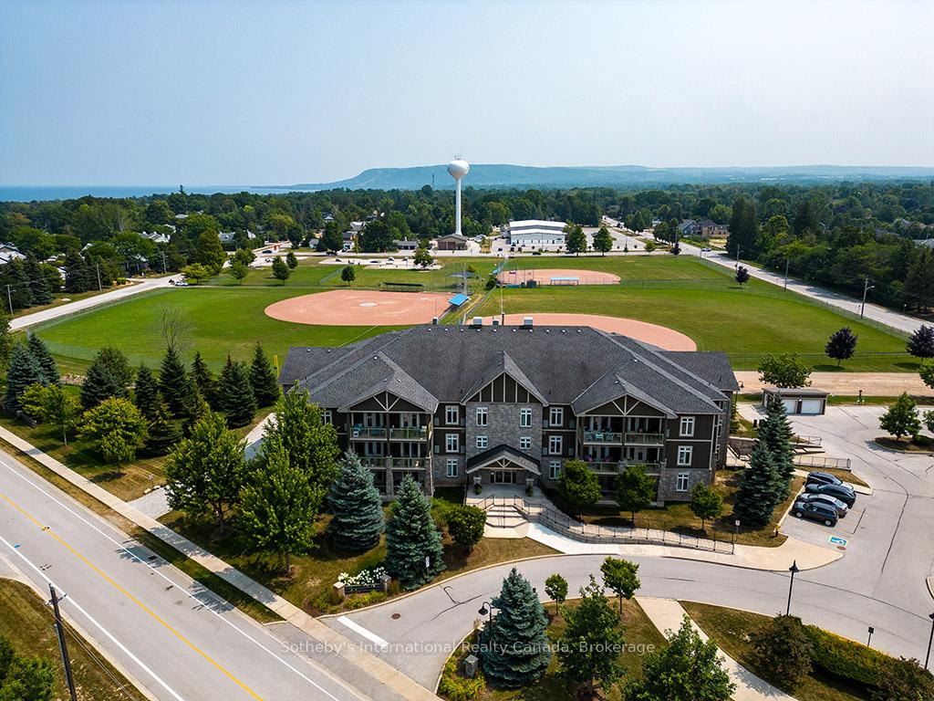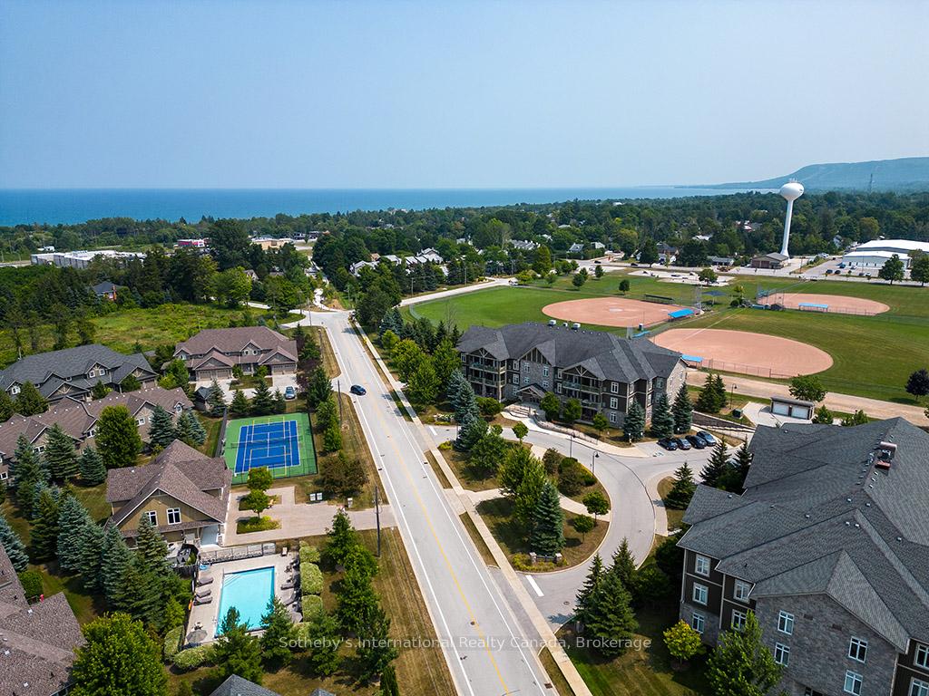 Prime location for this desirable unit set on the first floor in the very sought after Far Hills development. This very bright and spacious 2 bedroom, 2 bathroom suite with open concept living space features 1479 sqft. This beautiful suite has hardwood flooring, a gorgeous kitchen with granite counters, separate island and stainless steel appliances, a picturesque balcony, a large master bedroom with an ensuite with shower and separate tub and features a well sized additional guest room/office and full second bathroom. Amenities include designated underground parking, storage locker, inground pool, tennis courts, clubhouse and fully accessible with elevator and within walking distance to the exclusive boutiques and restaurants of downtown Thornbury, as well as the Georgian Trail and Thornbury harbour marina on stunning Georgian Bay.