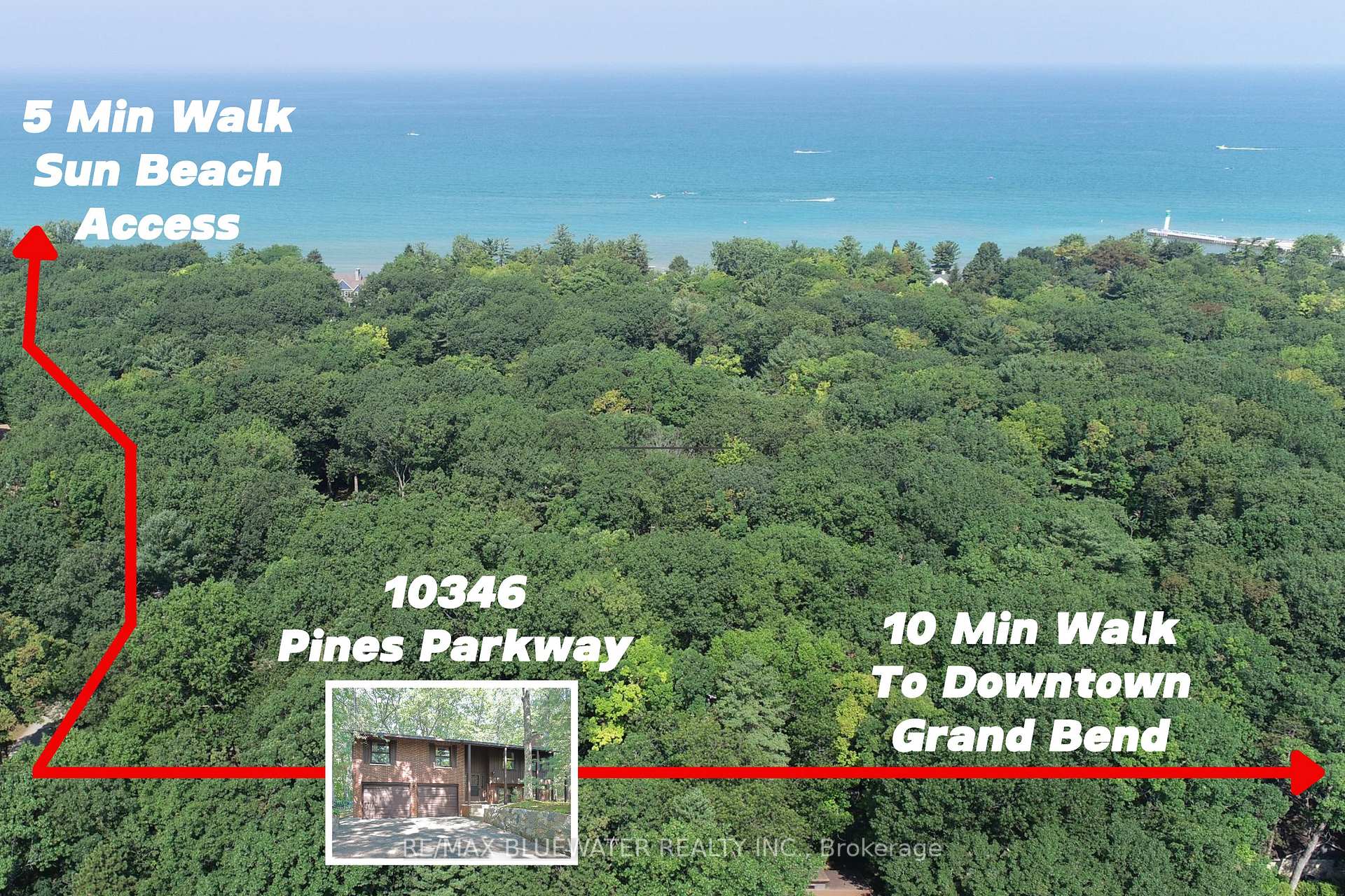 SOUTHCOTT PINES YEAR ROUND HOME JUST STEPS FROM DEEDED ACCESS TO PRIVATE SUN BEACH & SHORT WALK TO GRAND BEND AMENITIES! Welcome to 10346 Pines Parkway, Grand Bend in the highly desirable Southcott Pines subdivision nestled amongst the vast and beautiful Carolinian forest. Great curb appeal with double wide asphalt driveway leading up to 21x25 double attached garage and front covered entrance. This raised bungalow with its rustic charm offers a main floor of 1,242 sq. ft. Living room with a stone surround feature wall with wood fireplace insert. Spacious dining room allowing for ample room to enjoy dinner with friends and family. Kitchen with sliding door access to back raised deck. The 10x20 back deck was recently upgraded with composite boards and railing. Main floor offers an oversized primary bedroom with three piece ensuite and another two guest bedrooms that get to use the four piece bathroom with solar tube light. Lots of natural light throughout main floor! The fully finished lower level offers another 625 sq. ft. totaling 1,867 of finished square footage in the home. The lower level landing offers access to attached double garage, three piece bathroom, laundry room and spacious rec room. With the raised bungalow floorplan and the topography of the lot it allows for lots of natural light and a walkout sliding door from the rec room. This home has been an incredible place for this families two generations to create core memories that have lasted a lifetime. Now it is your family's turn to start creating those core memories today in Southcott Pines just steps from the shores of Lake Huron in Grand Bend today! Southcott Pines is an incredible lakeside subdivision with deeded Lake Huron beach access, long beach walks, incredible sunsets, clubhouse, community, kayaking, great walking/biking opportunities and so much more. Southcott Pines annual dues are $465 +HST.