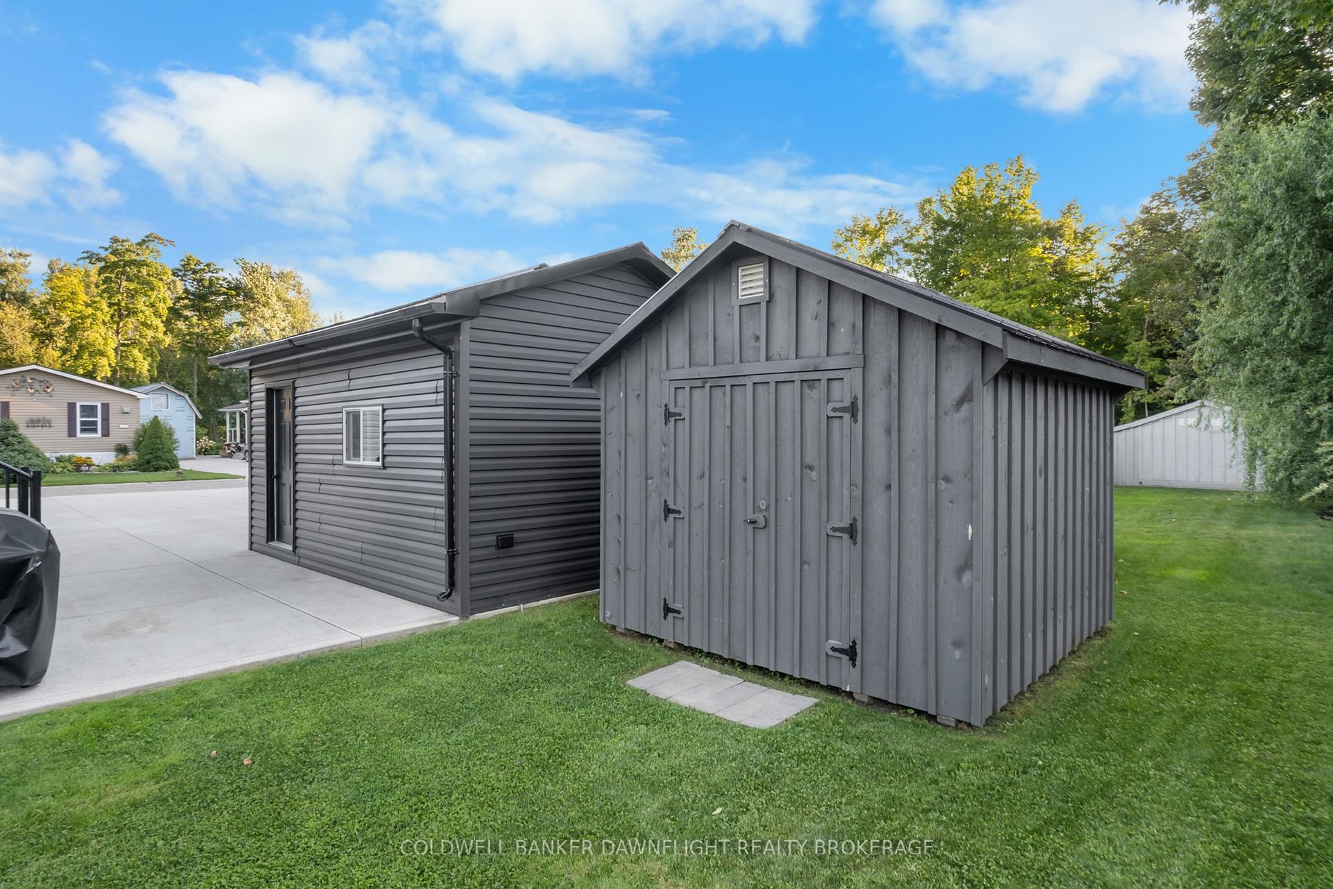 Welcome to Birchbark Estates, where this beautifully maintained Northlander home, built in 2019, offers 1,012 sq. ft. of comfortable living just minutes from Grand Bend and the shores of Lake Huron. The open-concept main floor features a bright white kitchen with quartz countertops, a spacious island with seating for four, and a welcoming living room complete with an electric fireplace and shiplap surround. The home includes two bedrooms, highlighted by a primary suite with a walk-in closet with built-ins, a second electric fireplace with matching shiplap detail, and a private 4-piece ensuite with a walk-in shower and double vanity. A second full bath and a well-appointed laundry room with built-ins add convenience. Outdoor living is enhanced by a large covered front porch, perfect for entertaining, along with a 10x10 garden shed and an insulated 12x18 garage. Residents enjoy a monthly fee of $445, which covers road maintenance, snow removal, garbage, water, and sewer. An additional parking area is available for trailers, campers, and boats. The community also offers optional access to an indoor pool and fitness facility. Additional features include a forced-air gas furnace, central air, and even the option to drive battery-powered golf carts throughout the neighbourhood.