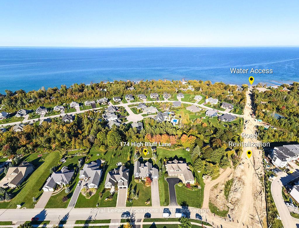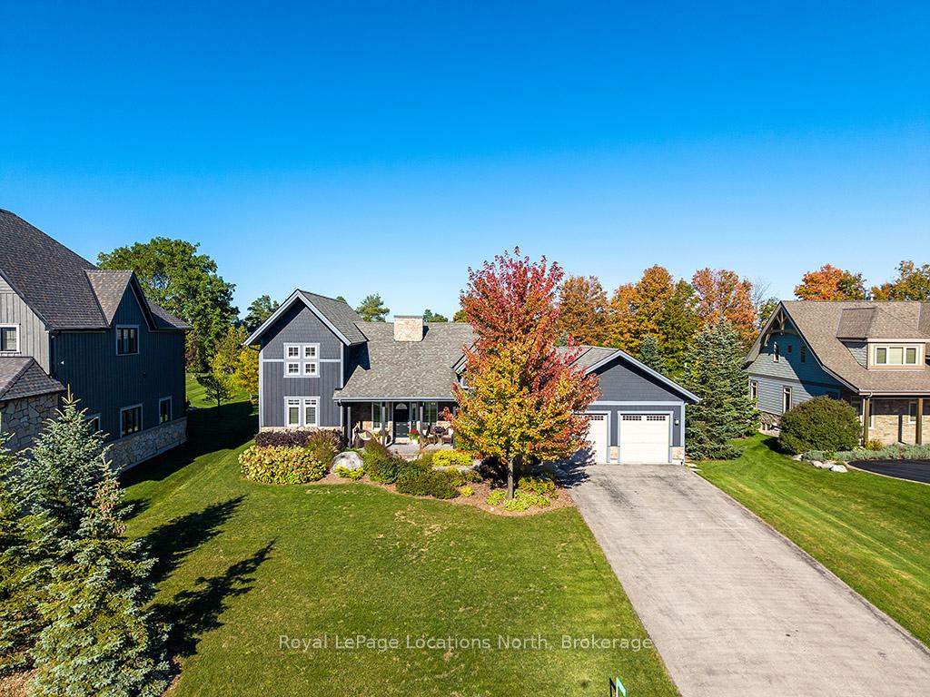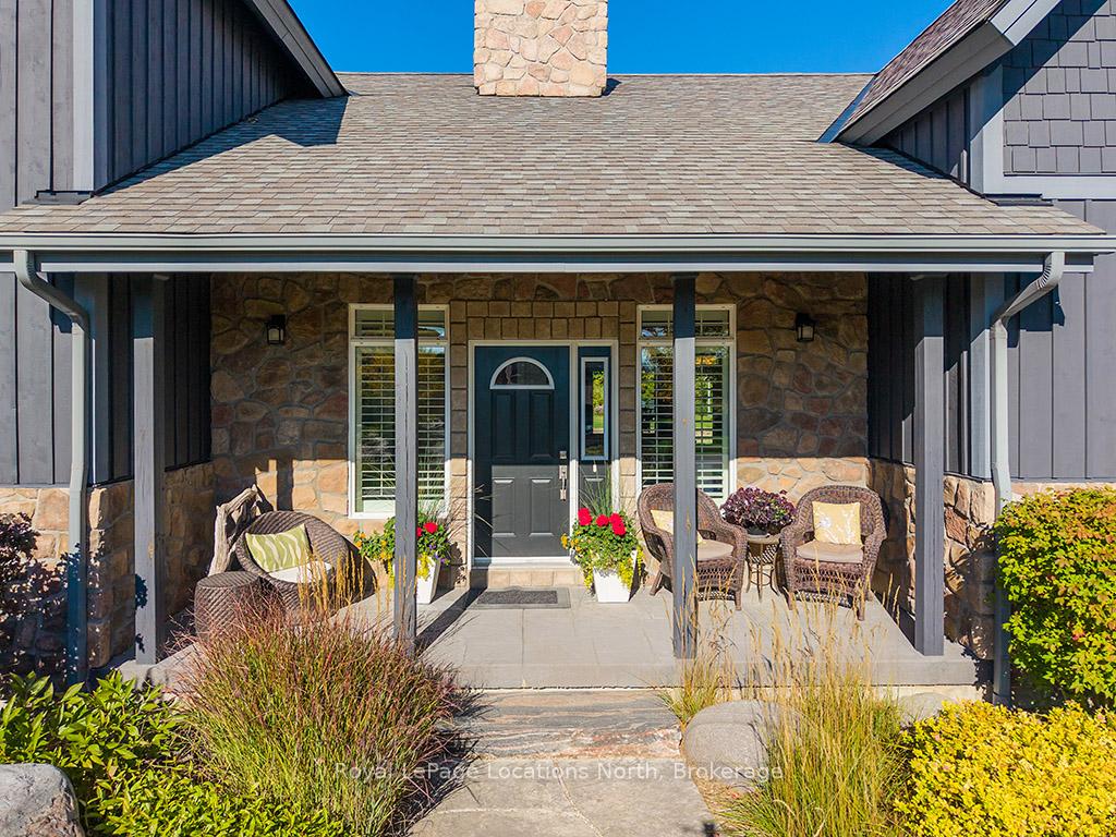 Welcome to 174 High Bluff Lane in the sought-after Trailwoods neighbourhood on the edge of Thornbury. This unique custom-built bungalow with loft blends contemporary style with rustic accents and offers over 3,600 sq. ft. of finished living space backing onto a protected ravine. From the moment you enter, you'll appreciate the craftsmanship and thoughtful details: 7" alder plank flooring, soaring vaulted ceilings, post and beam accents, shaker trim, and a grey-washed pine ceiling over the dining and kitchen. The open-concept great room impresses with custom cabinetry around a suspended linear gas fireplace, stone feature walls, and expansive windows that frame the professionally landscaped yard with slate patios and walkways, decking, gas outdoor fireplace, fire pit, and a garden shed with running water and hydro. The chefs kitchen boasts a massive waterfall island, upgraded appliances including a gas stove, custom cabinetry, under-cabinet lighting, and a walkout to the patio with a gas line for the BBQ. The main floor primary retreat features a walk-in closet and a spa-inspired ensuite with glass shower, and custom built double vanity. An office, powder room, and laundry with built-ins complete the main level. Upstairs you'll find two more bedrooms, a full bath, and a loft overlooking the living space. The fully finished lower level offers two additional bedrooms, a full 3-pce bath, storage room which could easily be used as a home gym, and a spacious family room ideal for gatherings. With the Georgian Trail across the street, Thornbury's shops, restaurants, harbour, and waterfront just a short walk or cycle away, and incredible skiing and golf just a short drive away, this property offers the perfect blend of modern luxury and four-season lifestyle.