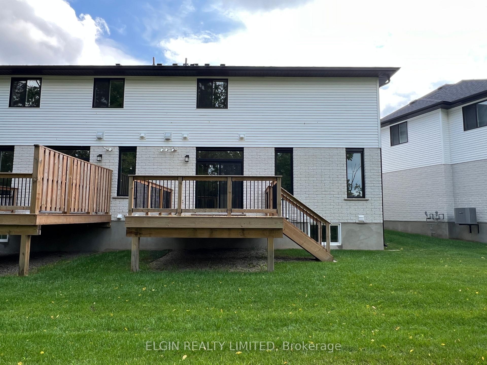 Welcome to 11-49 Royal Dornoch Drive beautifully crafted by Hayhoe Homes, this semi-detached two-storey perfectly blends luxury, space, and functionality across three finished levels. Offering 4 bedrooms, 2.5 bathrooms, plus a dedicated office, this home features an open-concept main floor with 9' ceilings, hardwood and ceramic tile flooring (as per plan), and a designer kitchen complete with hard-surface countertops, tile backsplash, island, and cabinet-style pantry. The kitchen flows seamlessly into the dining area and great room, highlighted by an electric fireplace and patio doors leading to a rear deck with views of trees and the valley beyond. Upstairs, the spacious primary suite includes a walk-in closet and a spa-inspired ensuite with a freestanding soaker tub, tiled shower, and double vanity with hard-surface counters. Three additional bedrooms, a 4-piece main bath, and convenient second-floor laundry complete the upper level. The finished lower level adds even more living space with a large family room and private office ideal for working from home. Additional features include 200 AMP electrical service, garage door opener, BBQ gas line, Tarion New Home Warranty, and numerous upgraded finishes throughout. Located in the desirable Shaw Valley community, close to parks, trails, schools, shopping, restaurants, and just a short drive to the beaches of Port Stanley.