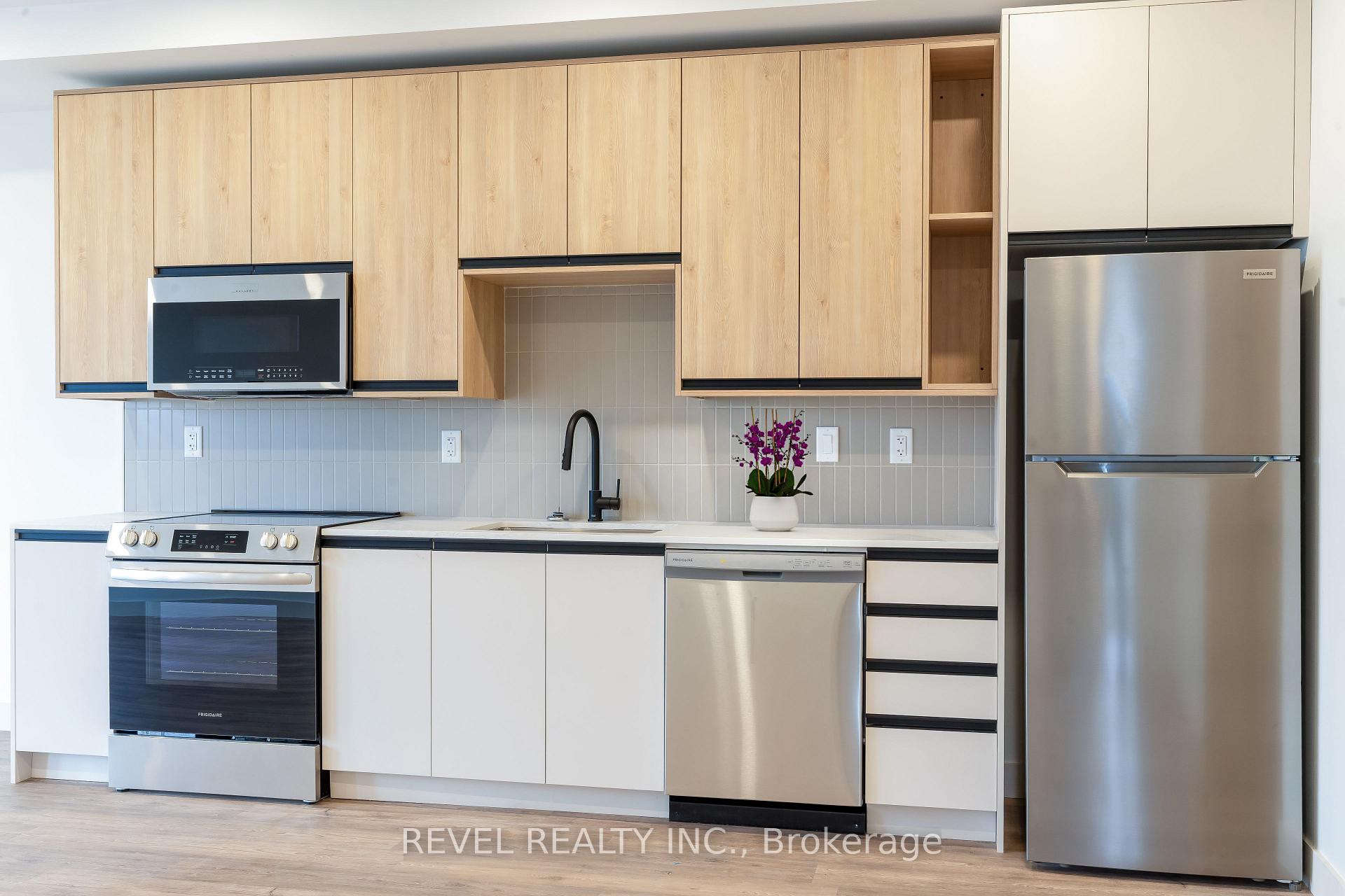 Experience modern living at The Madera with assigned secured/heated parking, smart home technology, and instant high-speed internet (included in rate from Cogeco) throughout the building. This pet-friendly community offers a safe and welcoming environment for those tenants seeking an upgraded lifestyle. This development offers modern interiors featuring luxury vinyl tile (LVT) in the foyer, kitchen, and living areas, with ceramic tile bathroom floors and tub/shower surrounds. Floor-to-ceiling windows, private balconies, and in-suite laundry are included in every unit, with two-bedroom layouts offering a tub in the main bath and a stand-up shower in the ensuite. Kitchens are equipped with large islands and quartz countertops, custom soft-close cabinetry, polished quartz counters with under mount stainless steel sinks and pull-down faucets, tiled backsplashes, under cabinet LED lighting, and a full stainless steel appliance package including dishwasher and microwave. Mechanical and plumbing features include air-source VRF heating and cooling, ERVs in each unit, modern plumbing fixtures, domestic hot water provided by an air-source heat pump, and a high-efficiency electric water heater. The building is finished with pot lights throughout, stylish flush-mount fixtures in living/dining areas and bedrooms, a TV-ready living room wall, and energy-efficient LED lighting across all common and private spaces.