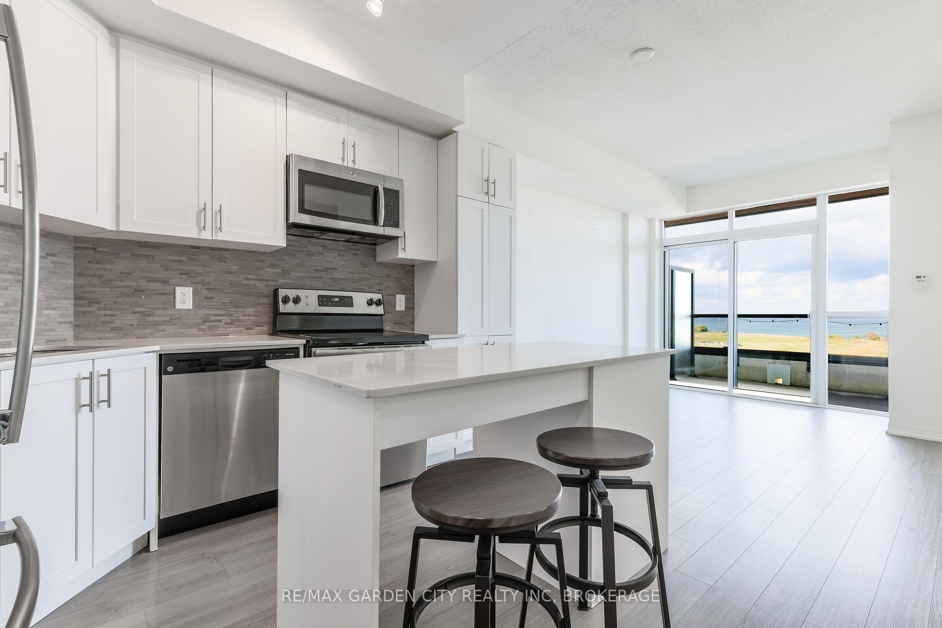 Spectacular upgraded 1-bedroom + den, 1.5-bath condo showcasing breathtaking views of Lake Ontario and an oversized 20-ft balcony spanning the full width of the suite-perfect for relaxing or entertaining. The modern kitchen features solid surface countertops and stainless steel appliances, while all principal living areas are carpet-free for a clean, contemporary feel. The spacious primary retreat offers a walk-in closet and private 4-piece ensuite. Rent includes one designated underground parking space (#71), storage locker, heat, and water. Residents enjoy access to premium building amenities, including a rooftop deck, fitness centre, and games/party room. Conveniently located near the waterfront, QEW access, shopping, and dining.