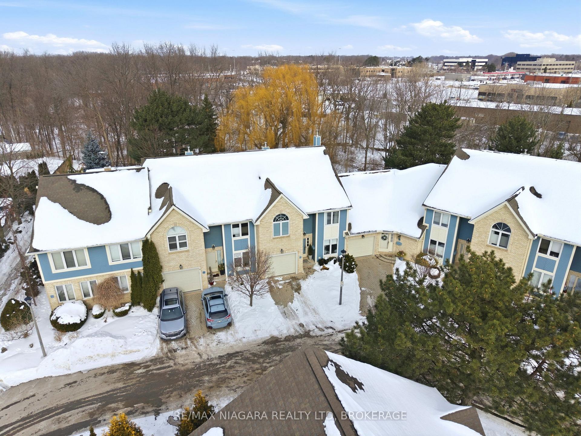 Welcome to Erion Village Estates, one of St. Catharines' most sought-after communities. This executive two-storey condo offers over 2140 sq. ft. of above-ground living space plus a fully finished basement and backs onto peaceful and scenic greenspace, providing a private, fully fenced nature rich setting to enjoy from the rear deck and multiple rear picture windows. Inside, the main floor features engineered hardwood (2020) and a bright, functional layout. The living room is warm and inviting with its gas fireplace and walkout to the deck, while the adjoining dining room showcases a charming bay window and French doors-ideal for formal meals, a home office, or a quiet retreat. The eat in kitchen offers generous counter space and unique stained glass accents. Upstairs, you'll find three well sized bedrooms and an updated 3 piece bathroom with heated floors (2020). The spacious primary suite includes a large walk in closet and a private ensuite complete with jetted tub, separate shower, and a newer vanity. Laundry has been conveniently relocated to this level but can easily be moved back if preferred. The recently finished basement (2020) adds even more versatility, featuring an impressive 8 foot dazzling electric fireplace, a 2 piece bathroom, and an additional office/bedroom. With soundproof insulation throughout, it's an excellent space for movie nights, hosting friends, or watching the big game or a new movie. Notable upgrades include: furnace/AC with humidifier and air purifier (2021), blown in attic insulation and extra insulation above the garage, ceiling fans, stainless steel appliances, and an automatic garage door opener. Located close to schools, shopping, highway access, and the hospital, this home blends comfort, convenience, and quality updates throughout with a truly prestigious address.