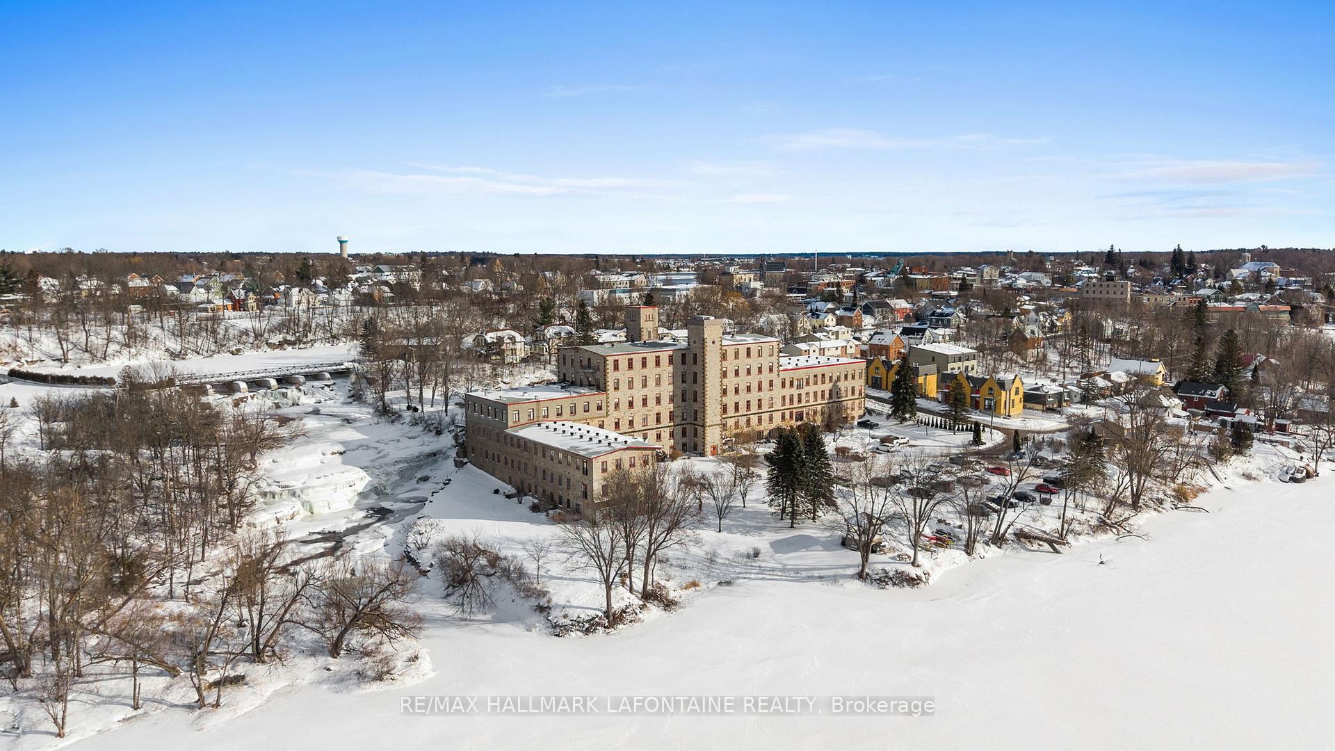 Welcome to The Millfall - where history meets the Mississippi River.This landmark 1800s textile mill has been masterfully transformed into 69 exceptional residences set across four acres of meticulously curated private grounds. Here, enduring craftsmanship and natural beauty exist in perfect harmony, creating a sanctuary that feels both elevated and profoundly tranquil.This home occupies one of the most coveted exterior-access points in the community. Step onto your private composite patio and take in uninterrupted views of cascading waterfalls and the river beyond. Mornings and evenings alike are accompanied by the gentle rhythm of flowing water, the dance of light across the sky, and the quiet serenity of a setting where history, artistry, and nature converge. It's more than a home-it's a rare vantage point where every moment feels thoughtfully curated for living well.Step inside and continue the dream: soaring 9.5-foot ceilings and 24-inch window sills enhance the integrated living and dining areas, which flow seamlessly into a spaciously renovated kitchen with abundant upgraded cabinetry and granite counters. The bedroom offers ample closet space and leads to your own upgraded ensuite with quartz counters and additional storage. A second powder room is perfectly positioned for guests. Need a den for working from home, a cozy reading area, or a hobby room? This home has it all-thoughtfully designed to suit every lifestyle.Residents enjoy a host of amenities, including an exercise room, workshop, library, recreation room, and rentable guest suite. Just steps from the Ottawa Valley Recreational Trail and River Walk, and only a five-minute stroll to Almonte's historic downtown with its renowned restaurants and boutiques, The Millfall offers a perfect balance of riverside tranquility with vibrant community living. Live elevated. Live serene. Live The Millfall.