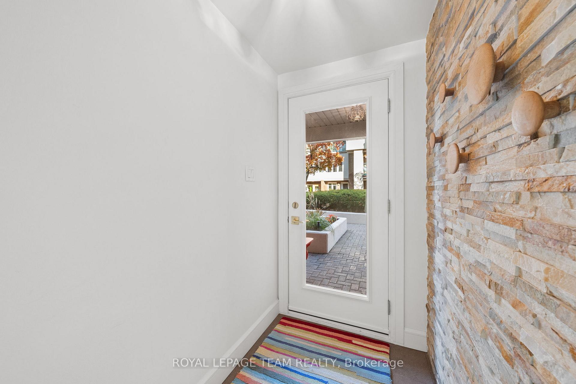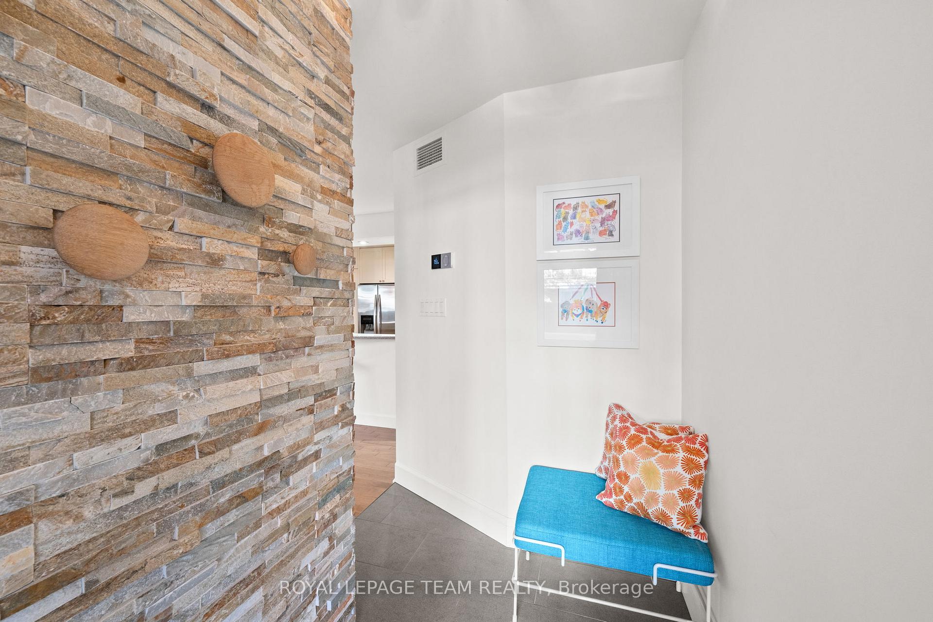 Welcome to The Waterbrooke, a true hidden gem nestled along the Rideau River in Overbrook, where comfort, style, and an unbeatable location come together effortlessly. This bright and spacious 2-bedroom condo offers the perfect blend of modern upgrades and cozy charm, overlooking the building's peaceful courtyard just steps from the water. Inside, you'll love the warm open-concept living and dining area featuring hardwood floors, pot lights, and a striking stacked-stone wood-burning fireplace - the perfect place to relax after a stroll along the river. The updated kitchen is both stylish and functional, complete with heated floors, quartz countertops, stainless steel appliances, soft-close cabinetry, a pull-out pantry, and under-cabinet lighting. Both bedrooms provide a calming retreat with plantation shutters, plush wool carpeting, and abundant natural light. The spacious primary bedroom includes a large walk-in closet with a built-in organizer and additional utility/storage space. The beautifully remodelled 3-piece bathroom features heated tile flooring, adding a touch of everyday luxury. A discreet laundry room with pocket doors is tucked off the hallway, offering excellent flexibility and potential to be converted into a convenient powder room. Thoughtful upgrades throughout enhance both function and flow, including glass-front display cabinetry, a built-in wine rack, and modern lever-style hardware. Additional amenities include secure bike storage, all within a beautifully landscaped community close to parks, trails, transit, and downtown Ottawa. This is riverside living at its finest - the perfect balance of nature, convenience, and city access.