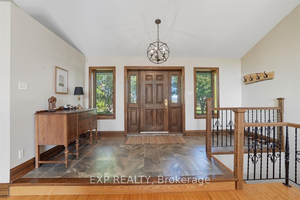 Experience an unparalleled rural lifestyle on this breathtaking (approx) 49.5-acre hobby farm, anchored by a custom-built ICF (Insulated Concrete Form) bungalow offering over 2,200 sq. ft. of high-efficiency luxury. Designed for the discerning buyer, the residence features a sophisticated open-concept floor plan with soaring cathedral ceilings and a magnificent floor-to-ceiling stone gas fireplace. The chef-inspired kitchen is a true centerpiece, boasting premium granite counters, built-in appliances, and a massive social island perfect for entertaining. The home offers three spacious bedrooms, including a primary retreat with a walk-in closet and a brand-new contemporary tiled shower. The expansive lower level provides incredible expansion potential with 9-foot ceilings, a secondary wood-burning stone fireplace, and a full bathroom rough-in-ideal for a home gym or additional guest suites. Enjoy the consistent comfort of radiant floor heating throughout both levels and the cooling of a wall-mounted A/C unit. The diverse grounds are a perfect blend of productive tillable land, fenced pastures, and mature woods with private trails. Equestrian enthusiasts will appreciate the turnkey 8-stall barn equipped with hydro, water, and a substantial hay loft. Complete with a double attached garage and unparalleled privacy, this rare (Approx.) 49.5-acre sanctuary offers a seamless fusion of modern structural integrity and peaceful country living. Book your private viewing today to experience this one-of-a-kind homestead.