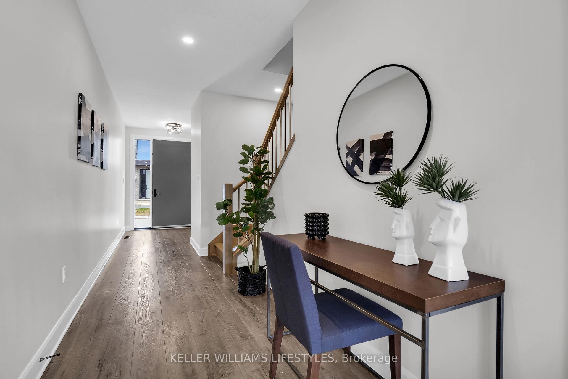 Located just minutes from London's west end, the charming community of Kilworth offers a perfect blend of small-town atmosphere and everyday convenience. Set near the Thames River and surrounded by natural scenery, this area provides easy access to the city while enjoying a quieter setting. This modern townhome is part of the Aura development, known for its contemporary architecture and stylish design.This approximately 1,731 sq. ft. two-storey townhome features 3 bedrooms and a bright open-concept layout. Highlights include 9-foot ceilings, 8-foot interior doors, an oak staircase with steel spindles, wide-plank stone polymer composite flooring, pot lights, and modern fixtures throughout. The great room flows into a gourmet kitchen with quartz countertops, a large peninsula, modern cabinetry, and a stainless steel appliance package. The primary bedroom offers a spa-inspired ensuite with glass shower, double sinks, quartz counters, and a walk-in closet. Additional features include an unfinished basement, large windows, and a deck off the great room. *Renderings and model suite photos are conceptual and for marketing purposes only. Actual unit specifications and finishes may vary.*