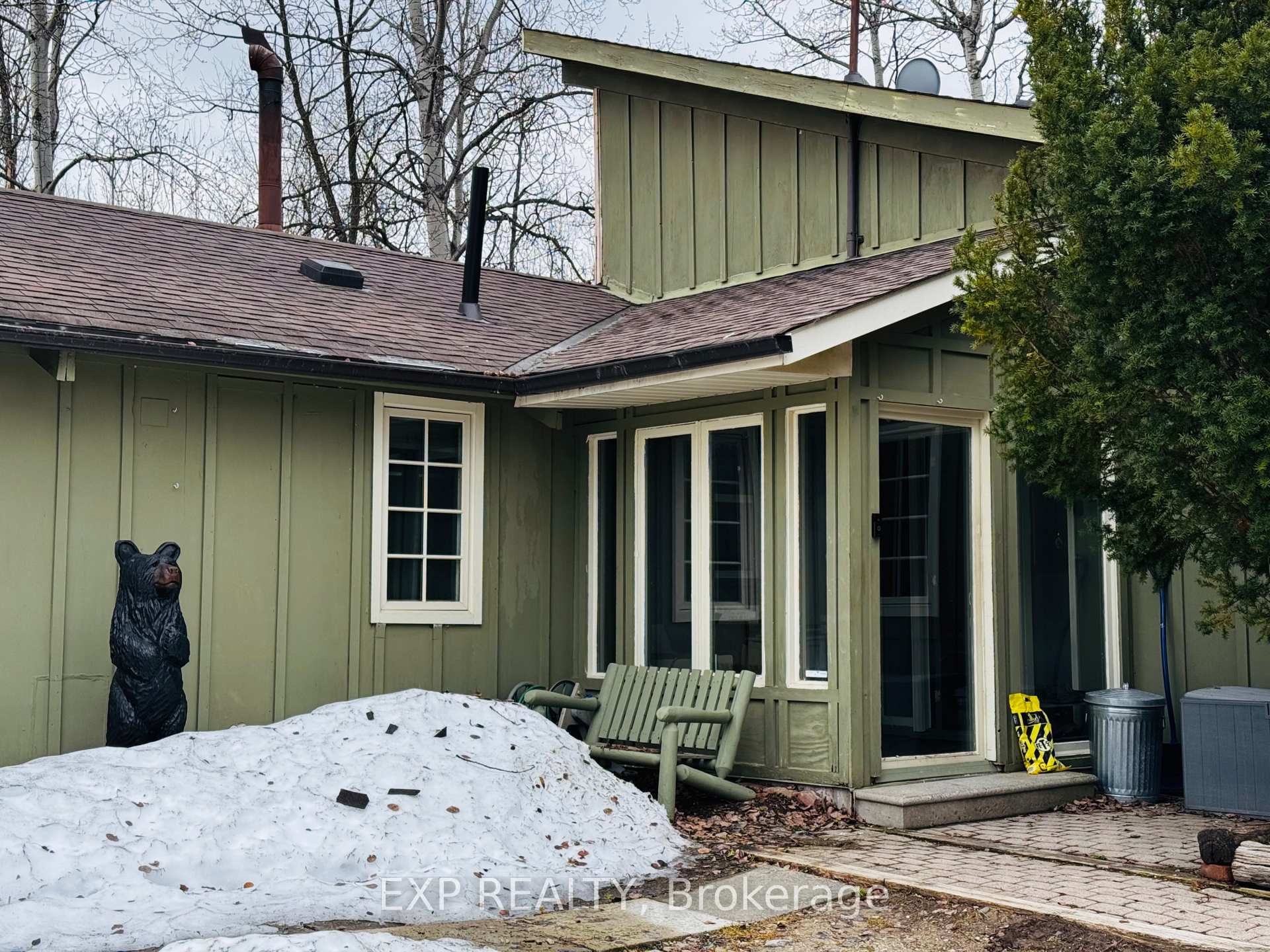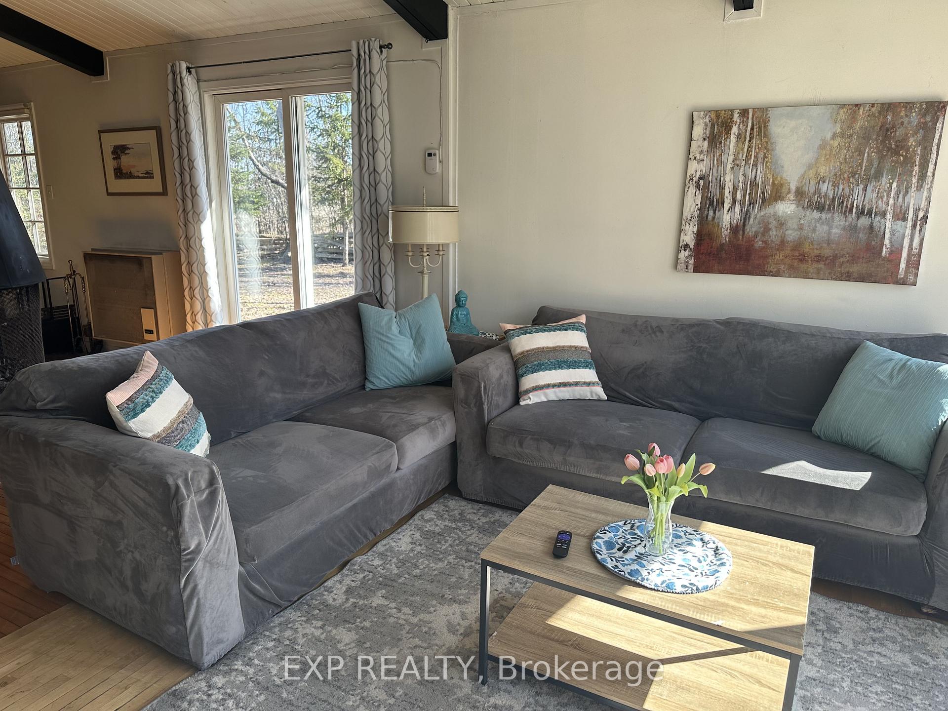 Pet-Friendly Annual Lease Within Walking Distance to Blue Mountain Village Available June 1st. This charming 4-bedroom, 1.5 bath chalet offers an unbeatable four-season lifestyle and the privacy of a forested half acre lot. The main floor features 3 cosy bedrooms, an open-concept kitchen, dining, and living area with vaulted ceilings and a central wood-burning fireplace, a den, and main floor laundry. Two patio doors open to a private backyard, and there is ample parking for family and guests. Upstairs, a fourth bedroom with retro charm offers views of the ski hills, adding to the chalet's character and warmth. After a day outdoors, unwind in your own private sauna. A new metal roof is being installed in May, offering added durability and peace of mind. All of this within walking distance to the Blue Mountain Village's restaurants, shops, ski lifts, and hiking trails, while still enjoying privacy and quiet at home.