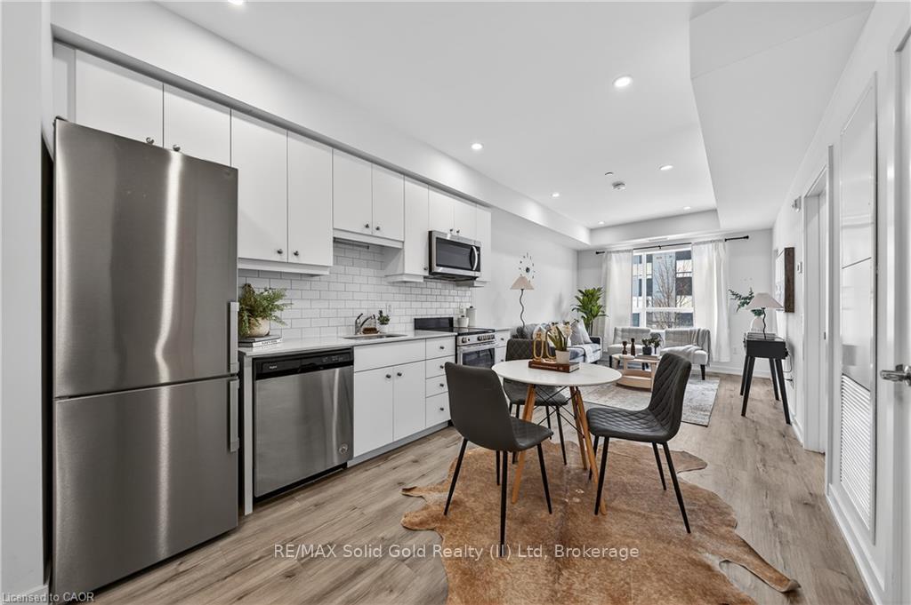 Available MAY 1st! Discover low-maintenance, modern living in the heart of Waterloo. Unit 210at the Blackstone is a bright, airy 1-bedroom, 1-bath condo offering 573 sq ft of comfortable space. Tall ceilings and built-in blinds enhance the open-concept layout. The kitchen is equipped with stainless steel appliances, durable stone countertops and a contemporary tile backsplash, flowing into the cozy living area with walkout to a private balcony - perfect for morning coffee or evening relaxation. The carpeted bedroom includes a roomy walk-in closet and the 4-piece bathroom is well-appointed. Practical conveniences include in-suite laundry, a storage locker and one underground parking space. The building elevates daily living with plentiful amenities: rooftop terrace with BBQs, exercise room, courtyard with BBQ and firepit, party/study room, bike room and visitor parking. Ideally situated close to Conestoga Mall, grocery stores, restaurants (including Browns Socialhouse), St. Jacobs Market, walking trails and public transit. Ideal for professionals or anyone seeking a well-located, amenity-rich rental in Waterloo.