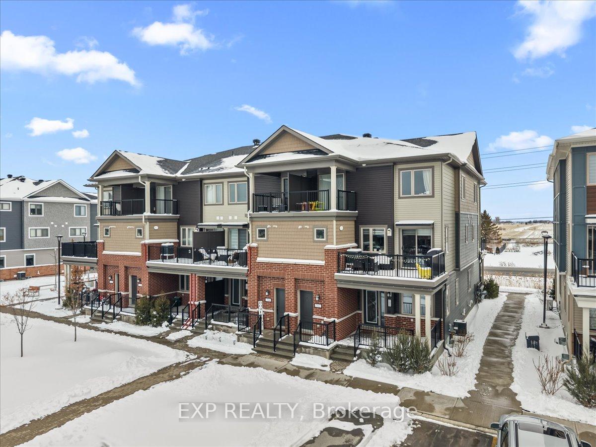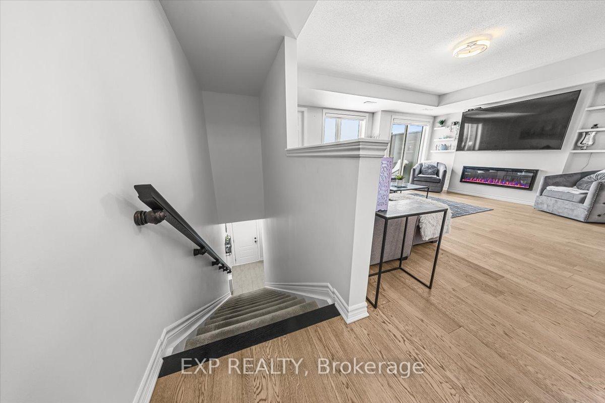 Welcome to this beautifully maintained, move-in-ready upper-level stacked townhouse in the highly desirable Blackstone community of Trailwest / Emerald Meadows, perfectly located on the border of Kanata and Stittsville. Offering a rare dual-ensuite bedroom layout, this stylish and upgraded home provides exceptional comfort, privacy, and turnkey living in one of Ottawa's fastest-growing neighbourhoods. The main level features engineered hardwood flooring and remote custom blinds throughout, creating a modern and polished space that feels both bright and inviting. The extended builder-upgraded kitchen is a standout, showcasing an oversized island, quartz countertops, stainless steel appliances, and abundant cabinetry-perfect for everyday living and entertaining alike. The open-concept living and dining areas flow seamlessly around a sleek electric fireplace, with a mounted 75" TV included to create a ready-to-enjoy entertainment space. Step outside to your private balcony, ideal for morning coffee or evening unwinding. A convenient powder room completes this level. Upstairs, both bedrooms feature their own private ensuite bathrooms-an incredibly sought-after layout. The spacious primary suite offers a walk-in closet and a modern 3-piece ensuite with glass shower and granite countertops. The second bedroom includes its own covered balcony and a full 4-piece ensuite with granite countertops, making it perfect for guests, roommates, or a home office with privacy. One parking space included (#115). Ideally located close to parks, schools, shopping, transit, and everyday amenities. Freshly painted and truly turnkey-just move in and enjoy.