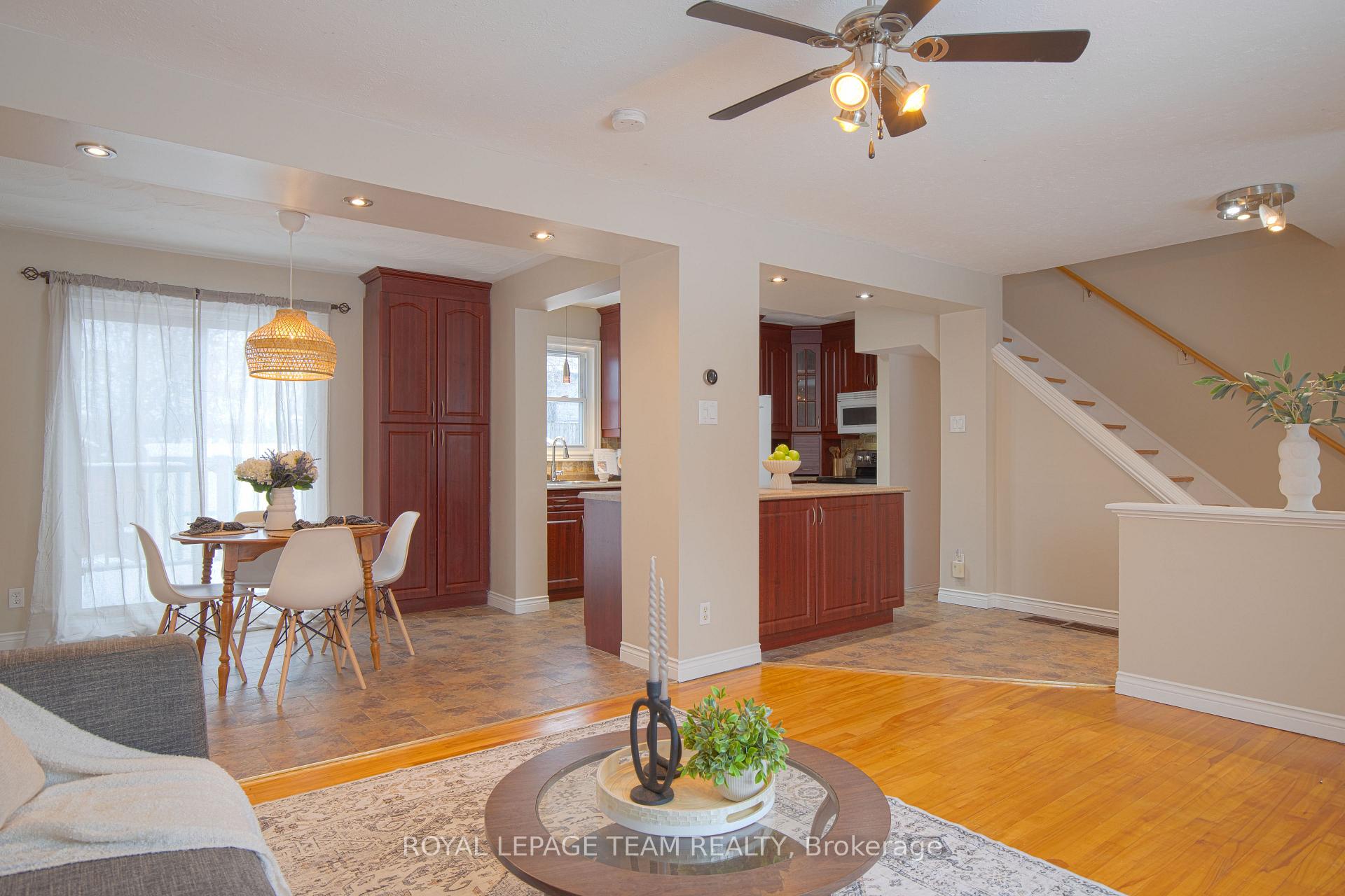 Rarely available ** FREEHOLD ** 4-bedroom townhome just minutes from downtown. Bright open-concept main floor with western exposure giving plenty of natural light. Updated kitchen with ample cabinetry and generous counter space. Dining area with patio doors leading to a large private deck overlooking a perennial garden and mature goji berry bush, all set within a fully fenced backyard. The second level offers three well-sized bedrooms and a full main bathroom. Partially finished lower level features a fourth bedroom with egress window, plus a spacious laundry and workshop area. Recently painted. Conveniently located close to shopping, parks, public transit, and a variety of French and English language schools. A freehold townhome offers GREAT VALUE - no condo fees! Come make it yours!