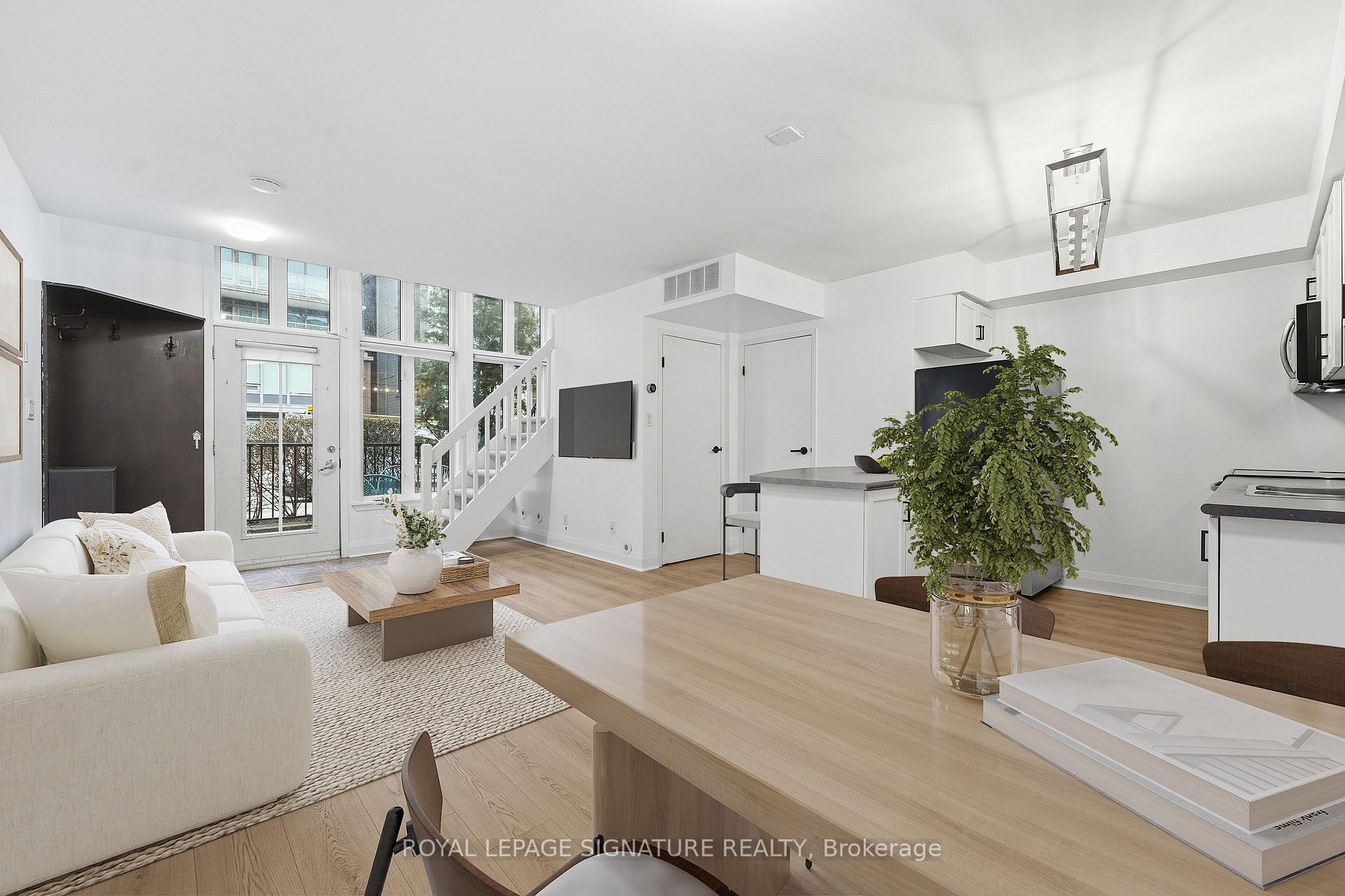 Bright south-facing two-storey loft-style townhouse in the heart of Liberty Village, offering 810 square feet of well-designed interior living space. This main level above grade townhome features 1 bedroom plus den and two bathrooms, including a main-level powder room, brand new flooring, paint and lighting. The open-concept main level is filled with natural light and offers a functional kitchen with full-size stainless steel appliances, generous counter space and an area for a dining table. The living space walks out to a large private terrace, ideal for everyday use and entertaining. The upper level features a spacious primary bedroom with an ensuite bathroom, along with a versatile den well suited for a home office or flexible living space. Parking and locker included, all the mechanical items are owned. Steps to Altea gym, the new Farmhouse market, plus all the shops, restaurants, transit, and everyday amenities you expect downtown.