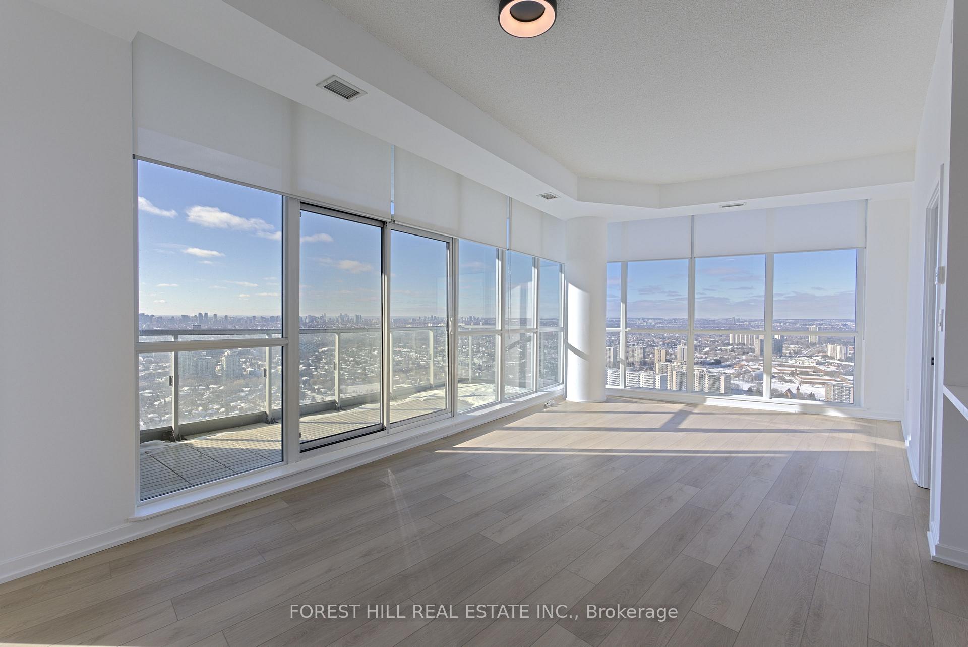 Rare, newly renovated northwest corner suite showcasing sweeping views of the CN Tower, downtown core, Yonge & Sheppard, etc. This bright, open-concept condo combines modern design with everyday comfort, featuring new flooring throughout, coordinated matte black hardware, custom light-filtering blinds and 10ft ceilings. The beautifully renovated kitchen boasts stainless steel appliances, electric cooktop, oven, refrigerator, microwave, and dishwasher. A striking quartz waterfall island with breakfast bar seating and generous under-island storage anchors the main living area. Both bathrooms are finished with sleek glass-enclosed showers and coordinated contemporary fixtures for a polished, cohesive look. Residents enjoy first-class building amenities including 24-hour concierge and security, a fully equipped gym, stylish party room, and inviting indoor swimming pool. Perfectly located directly above Don Mills Station, you are mere steps to CF Fairview Mall with quick, convenient access to Highway 401.