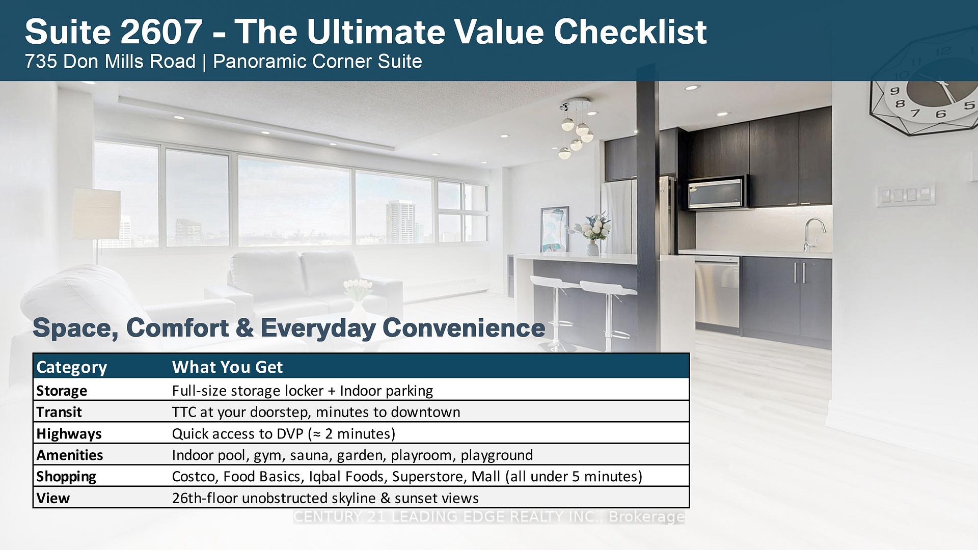 Welcome to Suite 2607 at 735 Don Mills Rd - a spacious, fully renovated corner unit offering exceptional value in today's market. With over 950 sq ft of living space, this home features a rare layout with generous room sizes and built-in cost savings that are increasingly hard to find. Located on the 26th floor, this bright unit offers unobstructed eastern skyline views, large windows, and abundant natural light throughout the day. The thoughtfully designed open-concept layout is ideal for both everyday living and entertaining. The modern kitchen has been fully renovated with quartz countertops, quartz backsplash, a waterfall island, new cabinetry, and premium LG stainless steel appliances, complemented by pot lights and updated fixtures. The bathroom features a sleek, contemporary glass stand-up shower. This well-maintained, non-smoking home includes 2 generous bedrooms, 1 underground parking space, and a large, full-sized storage locker. A major highlight: ALL utilities are included in the maintenance fees - heat, water, electricity, plus premium Bell Fibe 1.5 Gigabit unlimited internet, TV, and Crave/Starz - offering predictable monthly costs and meaningful savings compared to many condo buildings. Residents also enjoy access to premium amenities including an indoor pool, gym, sauna, and garden. Unbeatable location with TTC at your doorstep, quick access to DVP and Hwy 401, minutes to downtown, and close to Costco, East York Town Centre, parks, schools, libraries, banks, restaurants, and the upcoming LRT. An ideal opportunity for first-time buyers or investors seeking space, convenience, and long-term value in a well-established building. Excellent layout with premium renovations and truly hard to replace at this size and price point.
