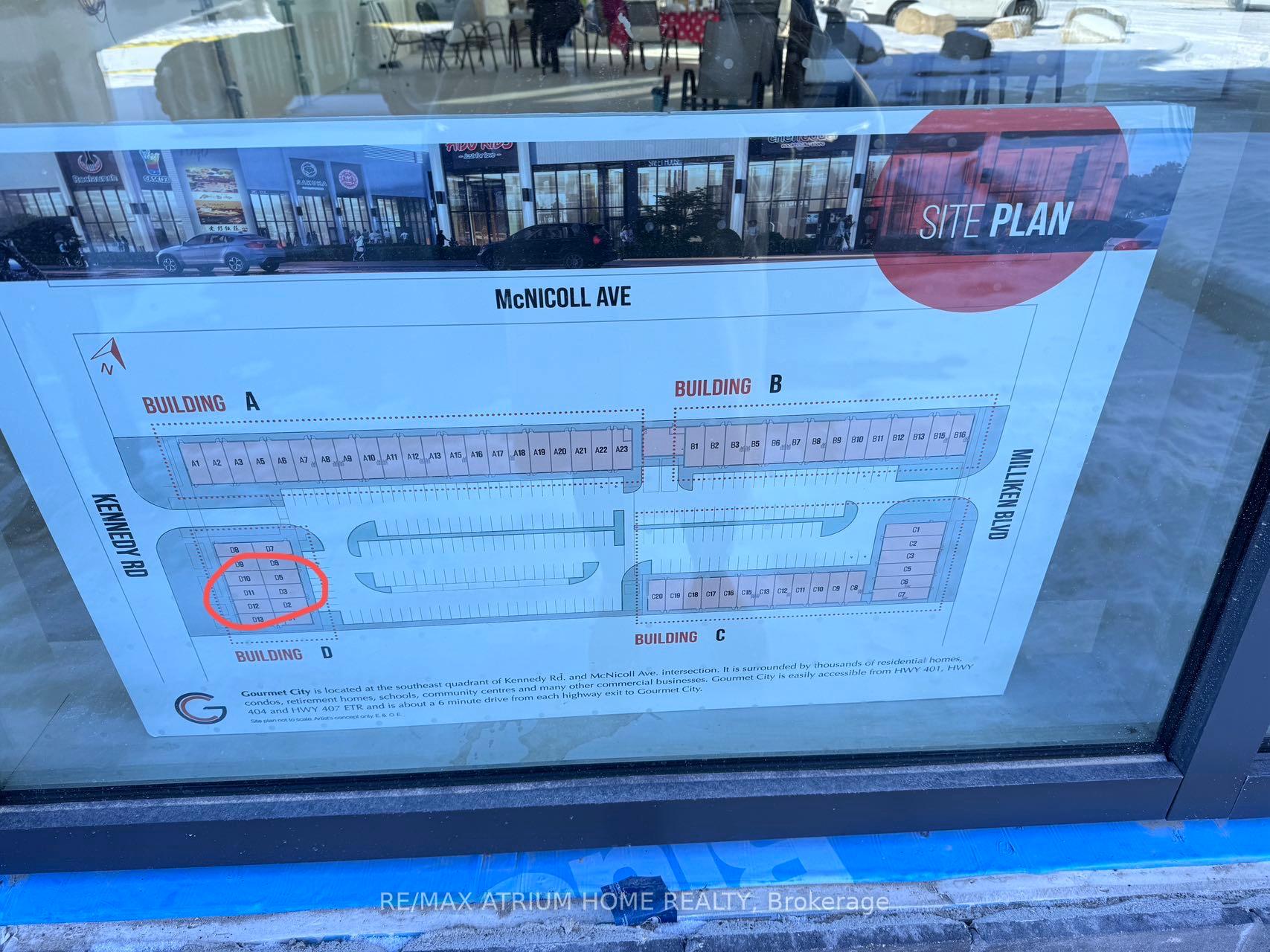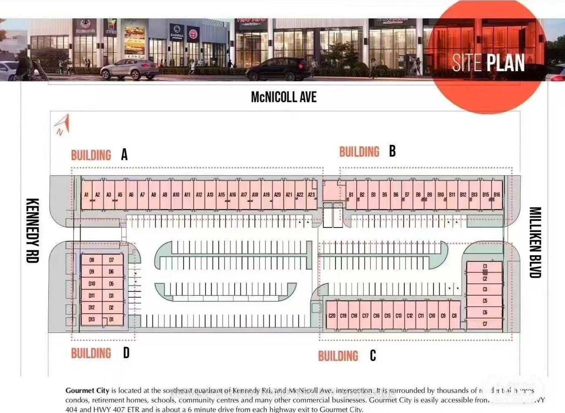 ** Frontage SIGNAGE on KENNEDY ROAD *** Gourmet City Commercial Condos is a newly developed culinary hub in Scarborough, ideally located at the southeast corner of Kennedy Road and McNicoll Avenue. This project offers excellent exposure and accessibility from both Kennedy Road and Milliken Boulevard. Developed by H & H Group, the plaza features modern architecture and high-quality finishes. The site benefits from high visibility and consistent foot traffic, making it ideal for a wide range of business opportunities.This is a brand-new unit with 20-foot high ceilings and in raw condition, ready for customization. The listing includes two combined units (D3 + D11), totaling 1,136 square feet (see floorplan). Permitted uses include restaurant, dine-in bakery, café, dessert shop, bubble tea, bar, and moreperfect for serving diverse cultural tastes.Just minutes from Highways 404 and 407. (Tax estimate $1485/mon, Management fee $395/mon, Insurance estimate $100/mon). Unit D11 faces Kennedy Road for prime visibility, while Unit D3 faces the interior parking lot. Features include two entry doors and two electrical panels for flexible use. ***Permitted uses include restaurant, Dining in bakery , cafe, dessert shop, bubble tea, Bar & more****