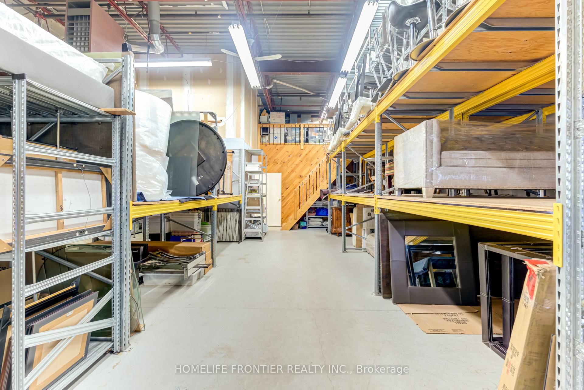 Versatile Industrial Condo with Finished Office & Mezzanine. Beautifully maintained 2,360 sq. ft. industrial condo, featuring 1,843 sq ft of ground-floor space plus a 516 sq ft mezzanine. The front portion includes approx. 600 sq ft of professionally finished office space with laminate flooring and expansive wall-to-wall windows overlooking manicured landscaping, Ideal for professional uses such as law, medical, dental, accounting or real estate. The office can be leased separately for additional income.The rear warehouse offers approx. 1,250 sq ft of open space with 17 feet clear ceilings, a ground-level shipping door (12' H x 10' W), and a separate man door. A 2-piece washroom is located between the office and warehouse areas. Mezzanine provides extra storage or workspace. Existing shelving can stay or be removed. Clean, bright and move-in ready. Zoned for a wide range of permitted uses.