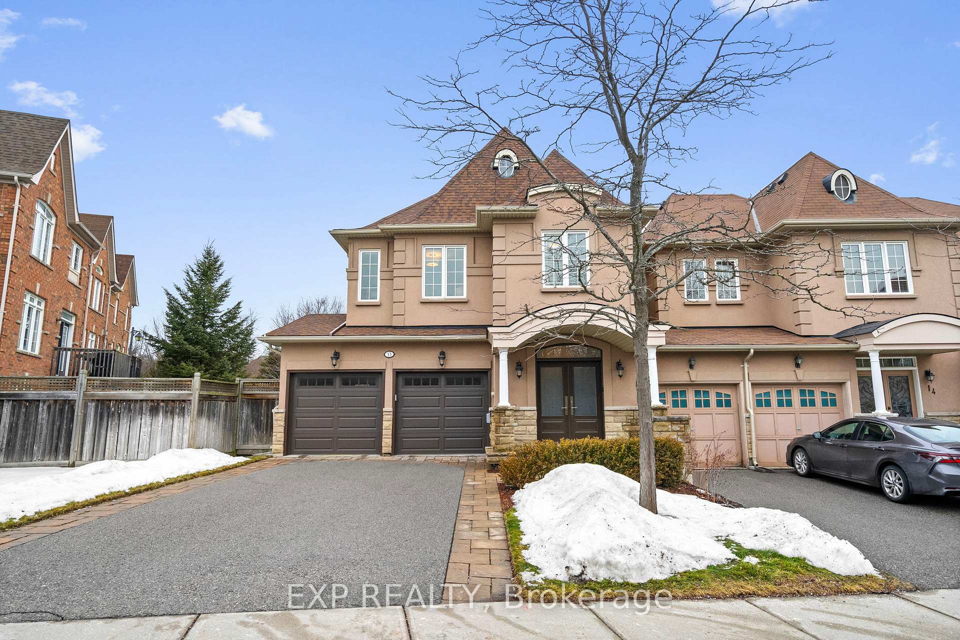 Queensgate luxury home in the heart of Fontainbleu, linked only by the double car garage. This premium end unit offers 2457 sq ft of elegant living space (above grade) and is ideally located adjacent to a parkette for added privacy. Bright and spacious open-concept layout with 9-foot smooth ceilings, hardwood floors and pot lights on the main floor. Gourmet kitchen features granite countertops, breakfast bar, stainless steel appliances and a tiled backsplash. Enjoy a cozy 3-sided gas fireplace, perfect for both living and dining areas. The large primary bedroom boasts a 5-piece ensuite and 2 oversized walk-in closet with built-in organizers by California Closets. Convienent second floor laundry. Professional landscaped with high-end TREX deck and fully fenced. Located in a family-friendly neighbourhood near top-rated schools including Lake Wilcox PS, Windham Ridge PS, Richmond Green SS. Close to parks, trails, shopping, Go transit and Highway 404.