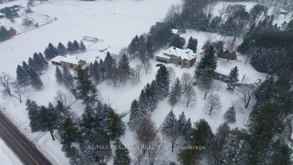 Welcome to a Magnificent Triumph of construction masterfully built on a 2.4-acre Gated Estate in Prestigious King, offering over 7,500 Sq ft of refined luxury living (5800 SQ.FT+2950 SQFT). A long, tree-lined approach unveils a residence defined by natural stone and brick masonry, balanced proportions, and striking architectural presence. Soaring two-storey 20-ft ceilings crown the grand great room, creating a dramatic yet elegant setting for entertaining. The chef's kitchen anchors the home with a quartzite island, premium built-in appliances, dual cooktops and ovens, and an oversized walk-in pantry. Each bedroom features a private en-suite, including a main-floor suite, designed for seamless multi-generational living. The upper primary retreat offers a spa-inspired en-suite and bespoke dressing room. The finished lower level, with 12-ft ceilings and golf simulator rough-in, adds exceptional lifestyle flexibility. Notable upgrades include dual HVAC systems, radiant floor heating, spray foam insulation, and a tankless water system. A 3-car garage, heated 30x30 workshop, and expansive two-tier deck complete the estate. Minutes to Hwy 400, top private schools, and amenities-an enduring legacy property defined by craftsmanship, privacy, and location.