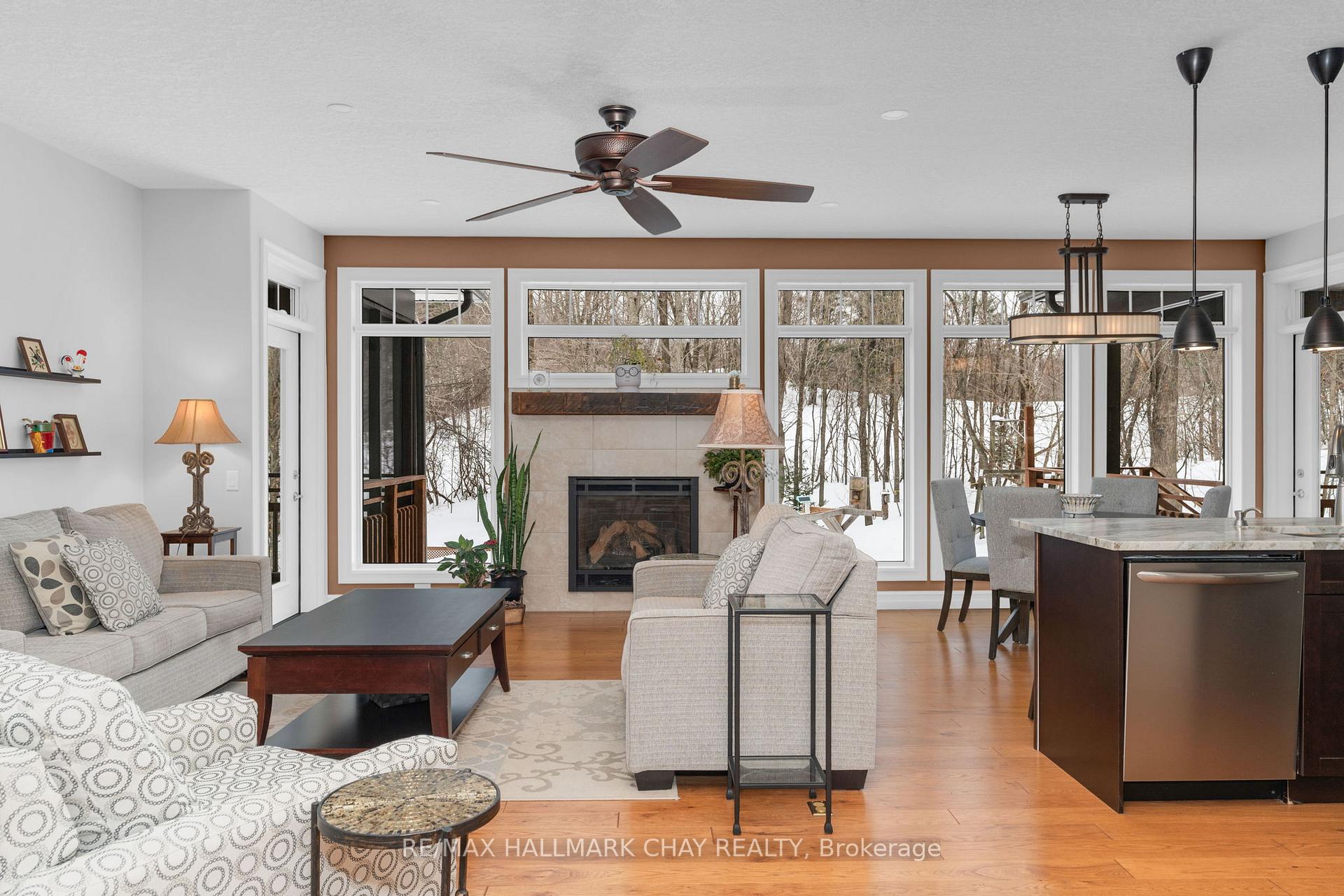 Exceptional pride of ownership in this custom built bunaglow, backing onto the 17 fairway of Horseshoe's Valley Course. This bright home with a raised back level has large windows throughout bringing lots of natural light in and gorgeous nature out door views. 9 foot ceilings on main floor and lower level.This beautiful open concept floor plan offers an eat in kitchen with stainless steel appliances, granite and quartz countertops. The living room has a gas fireplace with a wall of windows with nature view. The open concept area has two door accesses to a covered porch on one side off Kitchen and an enclosed screened room on the other side off Living room. Extended outdoor living. The primary suite offers a 4 pc ensuite and walk in closet. Seperate dining room and laundry room with garage access also on main floor as well as a second bedroom and full 4 pc bath. The bright lower level offers a 3rd bedroom and potentially a 4th bedroom or a gym presently being used as a office. Lower level also offers a 3pc bathroom. There is an unfinished shop space that could also be finsihed space if desired. Doors 34 " wide and lowered light switches to accomodate wheel chair access. Garage doors are 9 ft wide and garage is oversized at 25'2"x 23''1". This home has many custom touches including Rogers and bell high speed, leaf guard eaves, 200 amp service. Upgraded insulation, central vac, wet bar rough in basement. The exterior offers armour stone landscape and perernnial gardens. Walk to horseshoe resort, cross country ski out your yard, golf, alpine ski, vetta spa, hike, mountain bike and snowmobile out your driveway. Come live where you can play too.