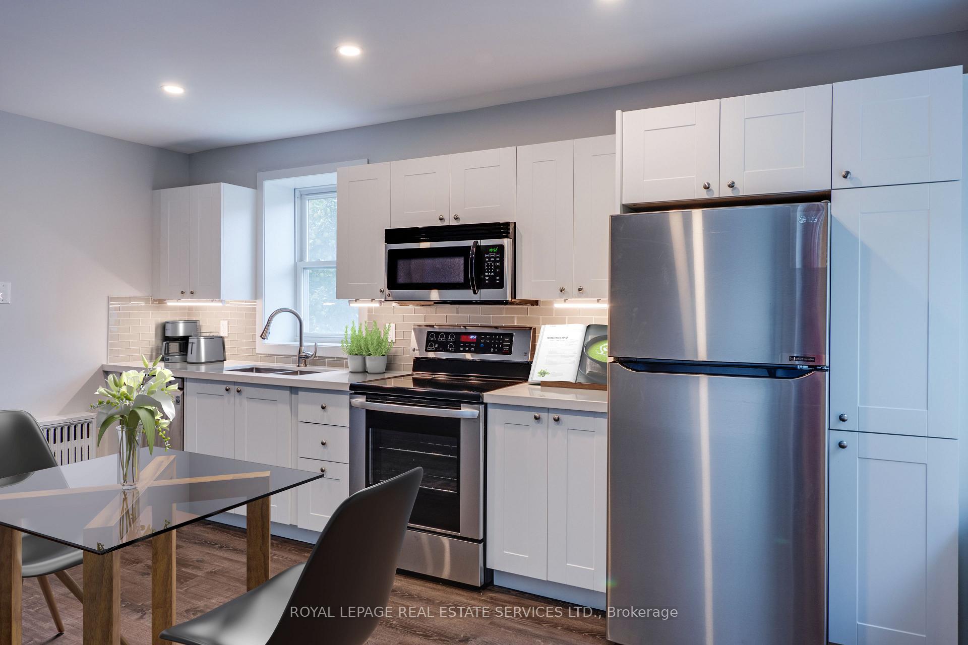 Spacious open-concept living area featuring a large window that fills the space with natural light. The renovated kitchen is equipped with stainless steel appliances, including a dishwasher, a ceramic backsplash, and ample storage. The unit offers a modern bathroom and a generously sized bedroom with a closet. Ideally located just steps from two TTC stops, providing a quick five-minute ride to Royal York Station. Enjoy walking distance to Humbertown Plaza and the Humber Ravine, with excellent schools and parks nearby. On-site laundry operated by Sparkle Solutions features a convenient reloadable card system. Green P street parking is available at exceptional rates, $1/12 hours. Photos have been virtually staged.