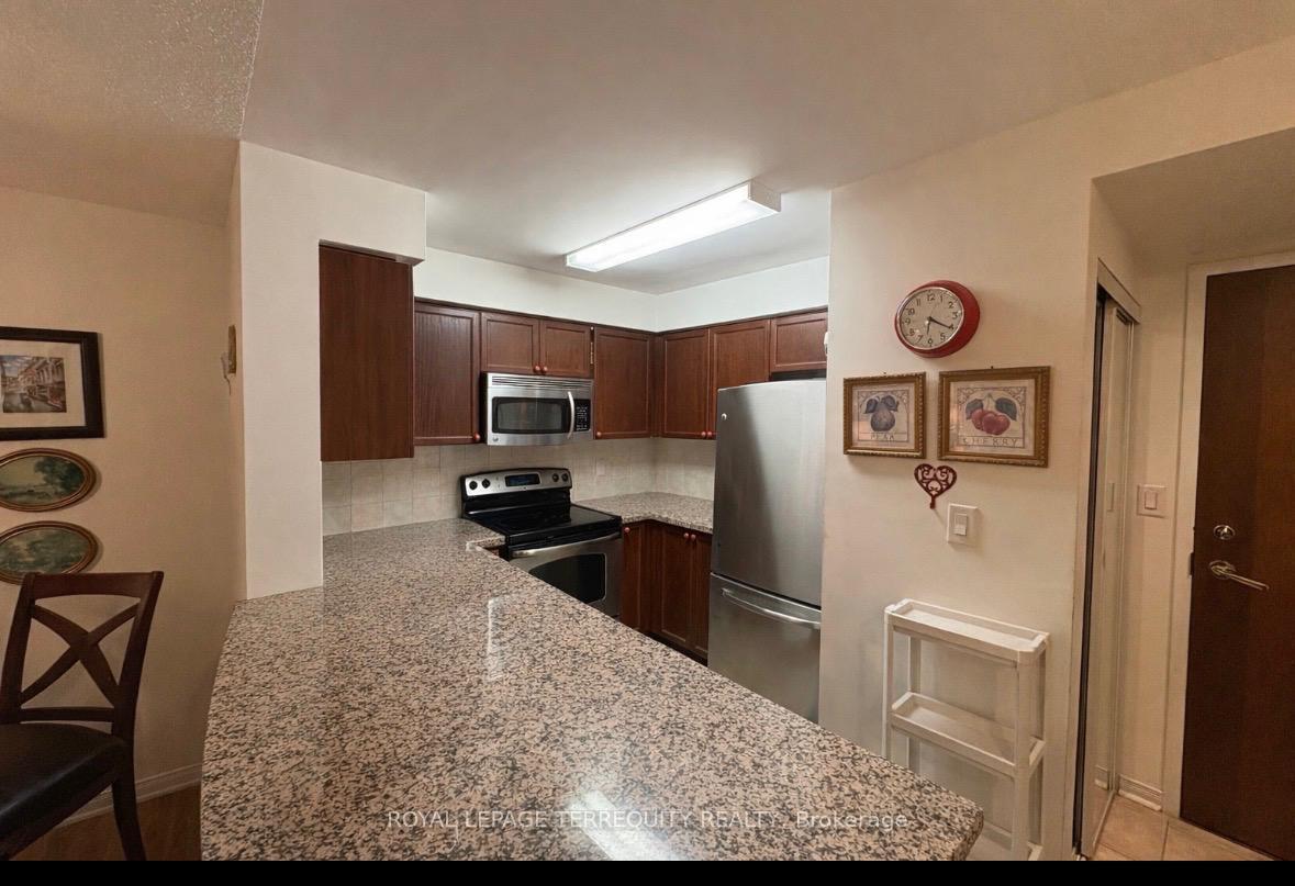 Highly Sought-After Eglinton & Glen Erin Location! Discover this stunning European-inspired 1 Bedroom, 1 Bath suite offering 600 sq. ft. of bright, thoughtfully designed living space, complete with 1 parking spot and 1 locker. Perfect for first-time buyers or those looking to downsize without compromise. The open-concept kitchen features granite counter-tops and a convenient breakfast bar, ideal for everyday living and entertaining. The spacious bedroom includes a large closet and almost floor to ceiling window, while the south-facing balcony fills the unit with natural light and offers a beautiful open view. Enjoy an exceptional lifestyle with resort-style amenities, including an indoor pool, fully equipped gym, sauna, virtual golf, and a rooftop terrace. The building also offers a gated entrance and 24-hour security for peace of mind. Steps to shopping, dining, entertainment, and transit-this is urban living at its finest. Don't miss this incredible opportunity!