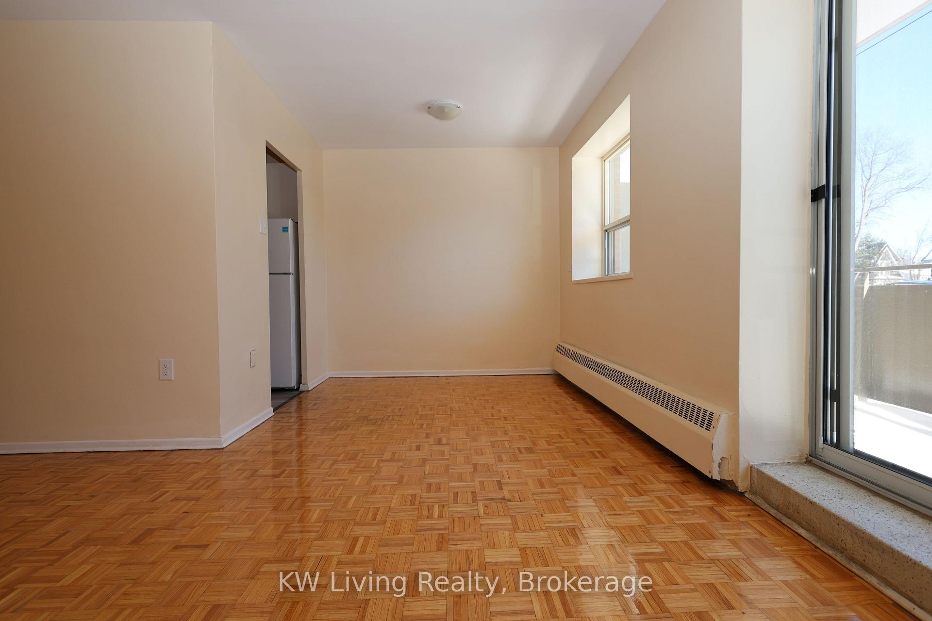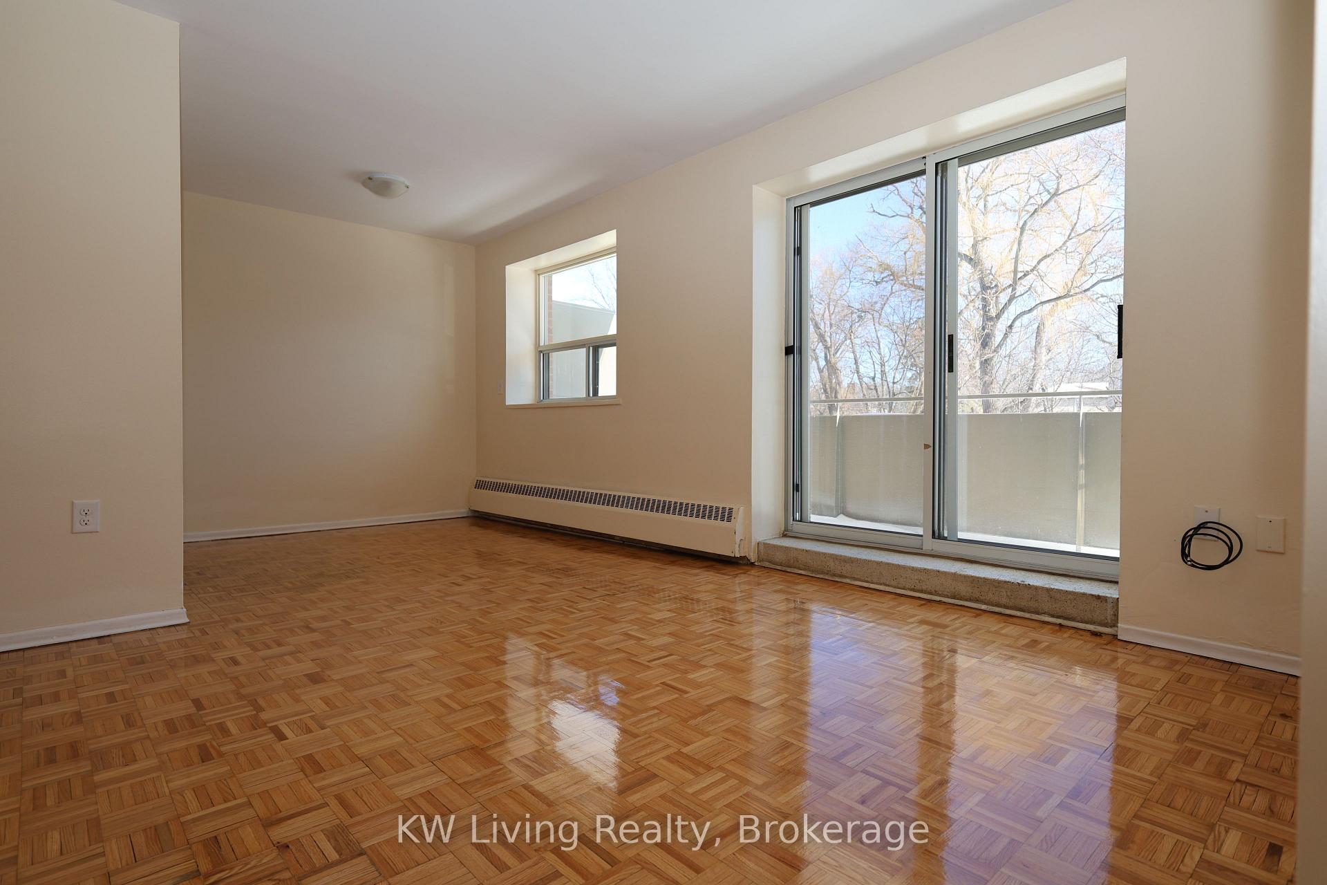 Bright and well-maintained unit located in a quiet, professionally managed building. Updated kitchen features new countertops, flooring, stove, and refrigerator. Floors have been freshly sanded and resealed throughout, with new electrical outlets added. Spacious bedroom includes a walk-in closet, and the unit offers a large 90 sq ft balcony. Heat, hydro and water are included in the rent. Tenant may use personal air conditioning unit at an additional cost with landlord approval. Coin laundry and elevator access are available in the building. Outdoor parking is available for $90/month. Superintendent on site. Conveniently located within walking distance to shopping, transit, Lake Ontario, parks and trails.