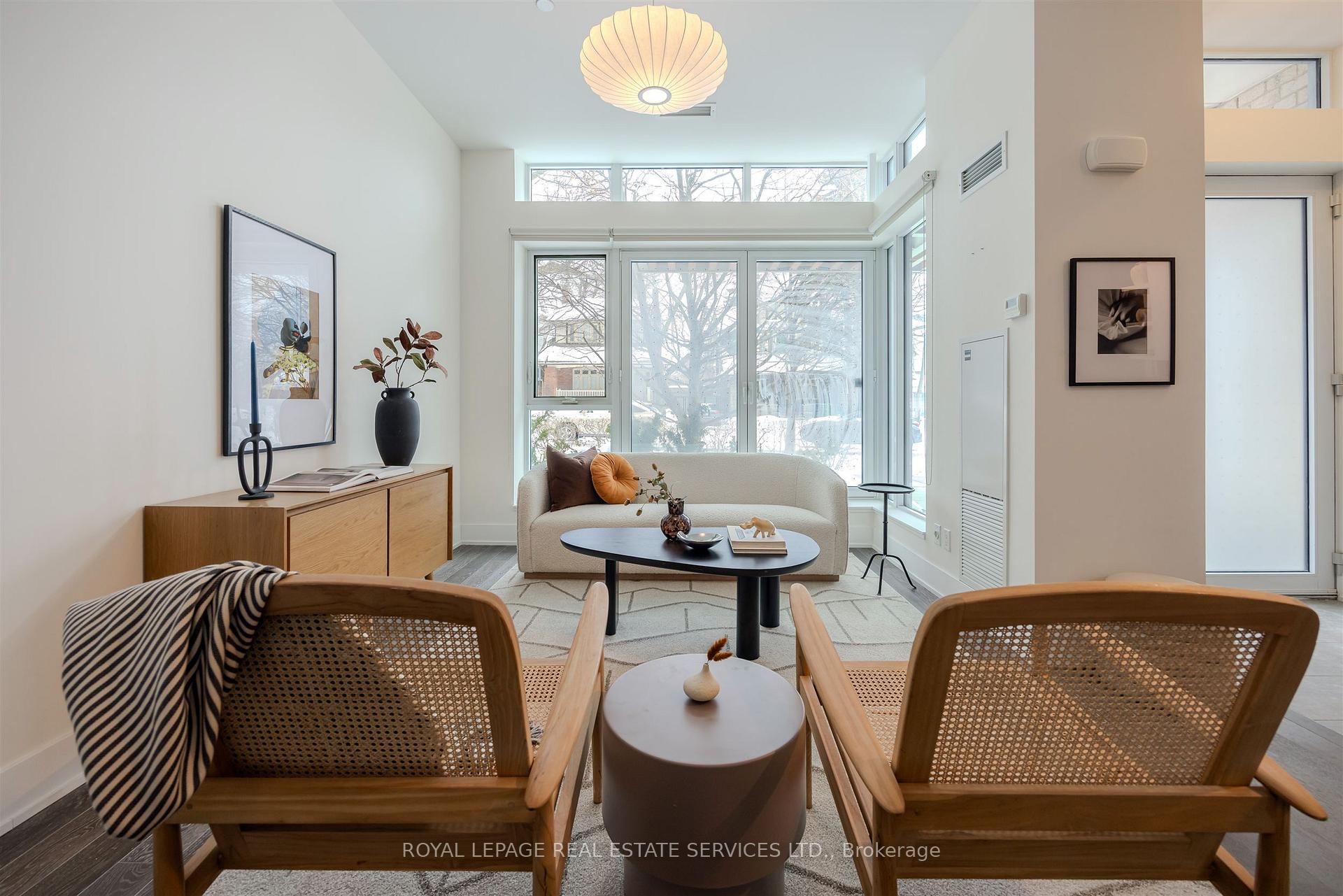 A sophisticated, light-filled two-storey 3 bed, 3 bath with balcony townhouse distinguished by mid-century modern influences, ideally suited to move-up buyers and discerning downsizers. Positioned directly across from High Park, this highly desirable residence offers 1,351 square feet of well-proportioned living space. The home features private street-level access in addition to interior condo entry, along with convenient second-floor access to building amenities.The open-concept main level is defined by 10-ft ceilings, expansive windows allow abundance of morning sunlight. A chef's kitchen with island/storage. Dedicated dining flows seamlessly into the living area, ideal for everyday living and entertaining. A tucked-away office/den/bedroom adds living flexibility. The ~10-ft upper-level primary king suite includes a private balcony overlooking the treetops, double door closet, and a 5-piece ensuite with premium finishes. The second bedrm also has floor to ceiling windows and double closet. Upper condo exit provides easy connection to amenities & a large locker just steps from the unit.One parking space & one locker are included.Residents benefit from a comprehensive suite of amenities, including 3 seasonal outdoor spaces (two rooftop terraces w/ BBQ stations & one third-floor terrace), yoga & Pilates studio, sauna, two party rooms, billiards room, home theatre, pet spa, rooftop gardening plots and garden workshop, and a fully equipped fitness centre. Bicycle repair depot and storage are available by registration fee, subject to availability. HighPark Condo is known as a professionally managed building offering a rare integration of natural surroundings and urban convenience. The property is within walking distance of Bloor West Village and steps to High Park subway station, neighbourhood cafés, Vivo Restaurant, 24/7 Rabba Fine Foods, and a range of local boutiques.An exceptional opportunity to enjoy townhouse living in a premier park-side location.